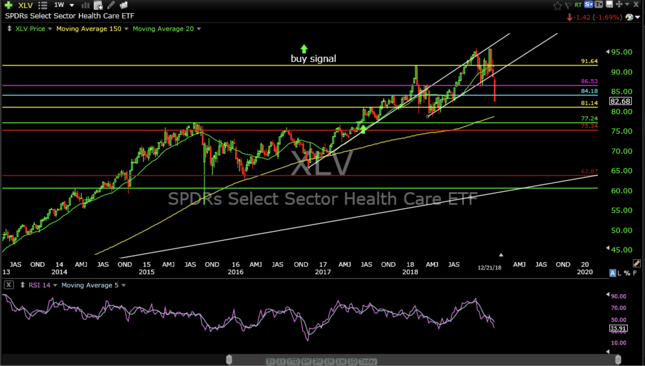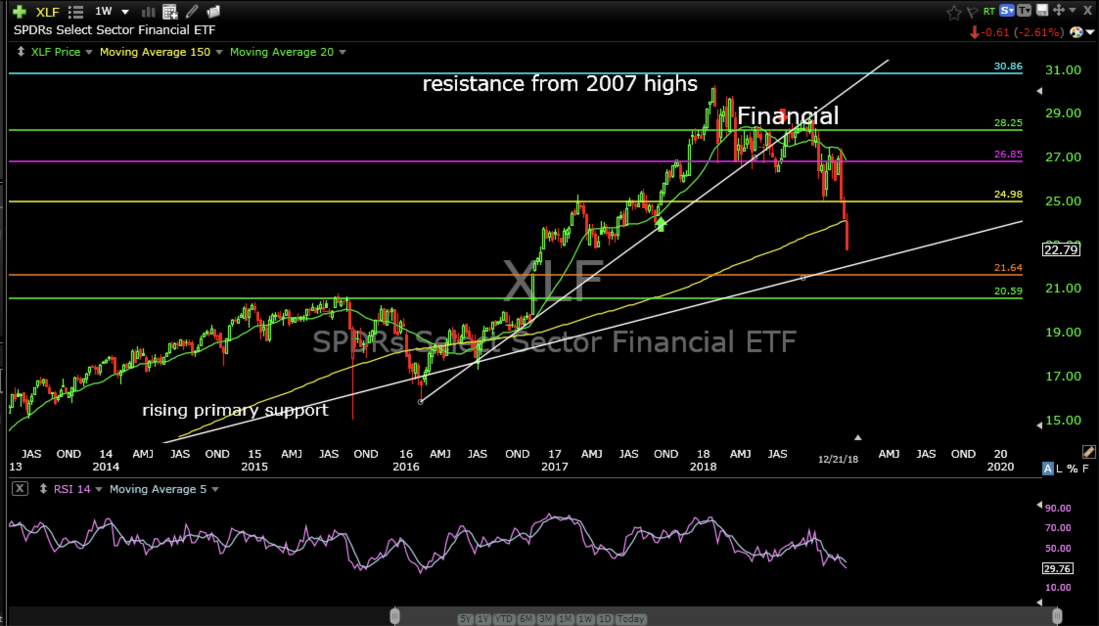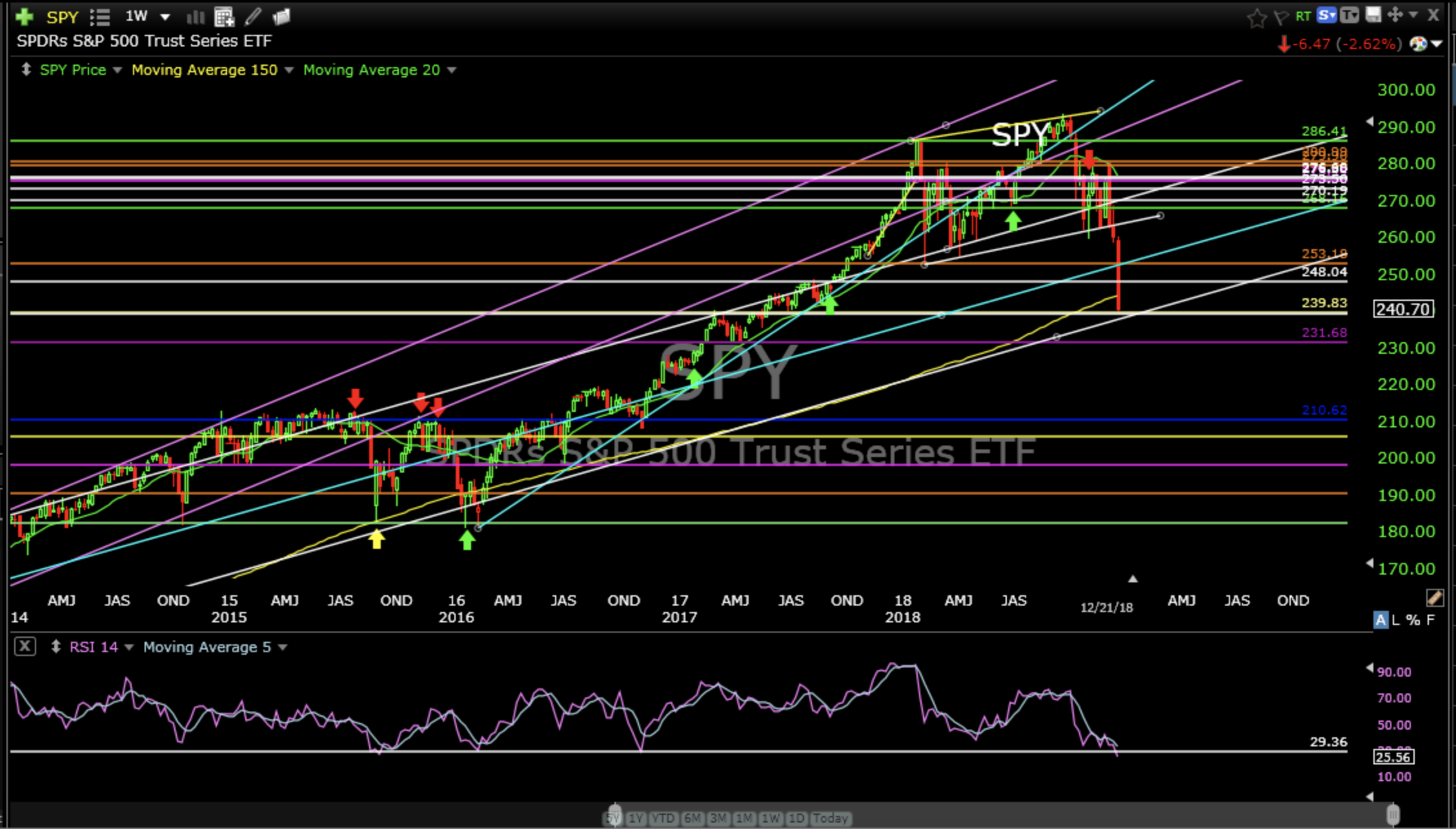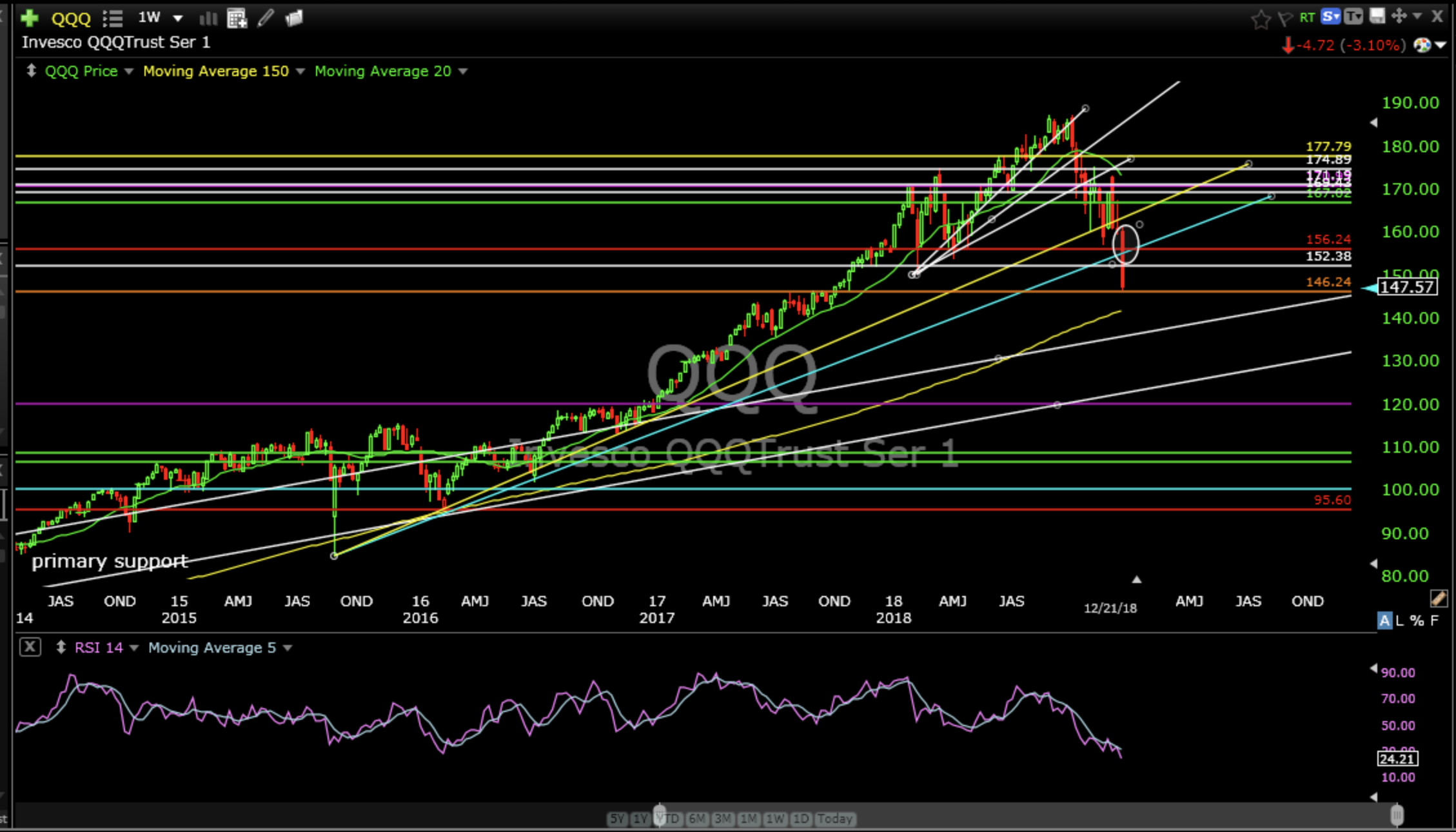 The level (primary support) SPY has fallen to is very important. Not that the levels we ripped through last week weren’t important but if primary support which is right below price is taken out this will signal further deterioration in price and likely the end of the current bull market. It it doesn’t bottom in here look out below. If it does that would make perfect sense as this is a strong support level. For this level to break requires no buyers, no confidence. That would be bad.