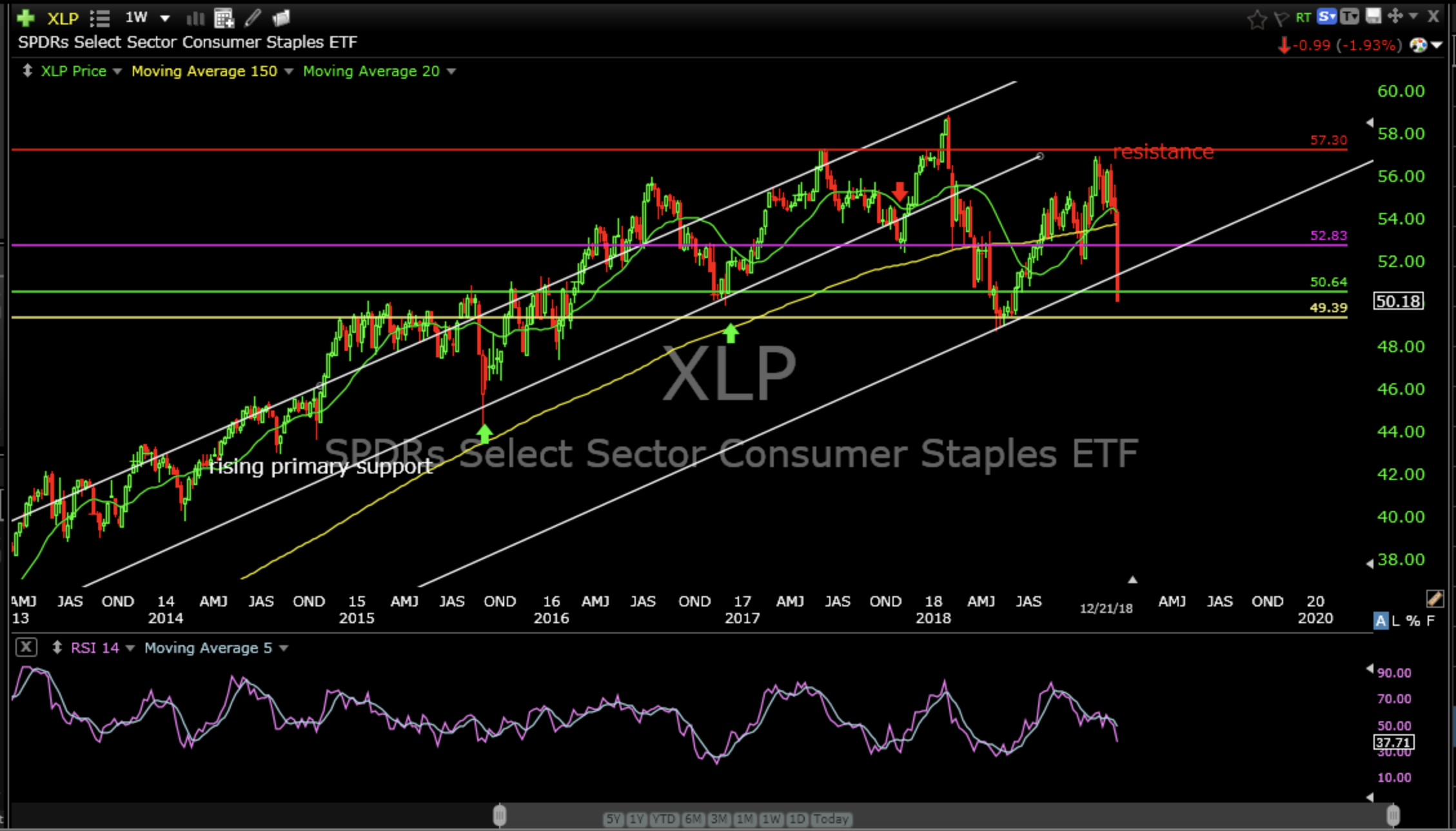 The Consumer Staples Sector ETF (XLP) broke primary support in October 2017 when I recommended selling it. It recovered for most of 2018 but just failed miserably last week breaking a secondary support level and closing just above a tight range that price traded in during most of 2015 into 2016.