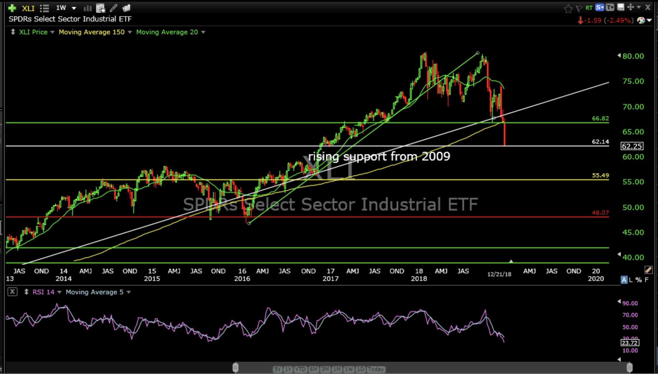 The Industrial Sector ETF (XLI) has now broken rising primary support with no real visible support until about 15% below Friday’s close.