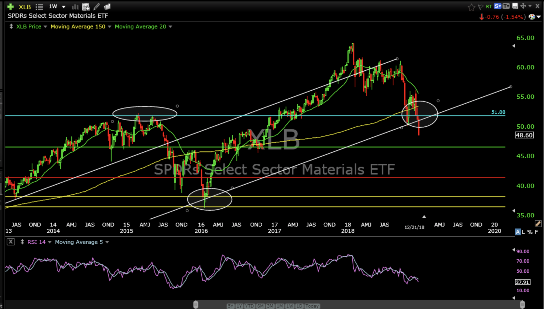 The Materials Sector ETF (XLB) looks a little like XLI, lousy. Broken secondary support last week and about 4% above the next level.