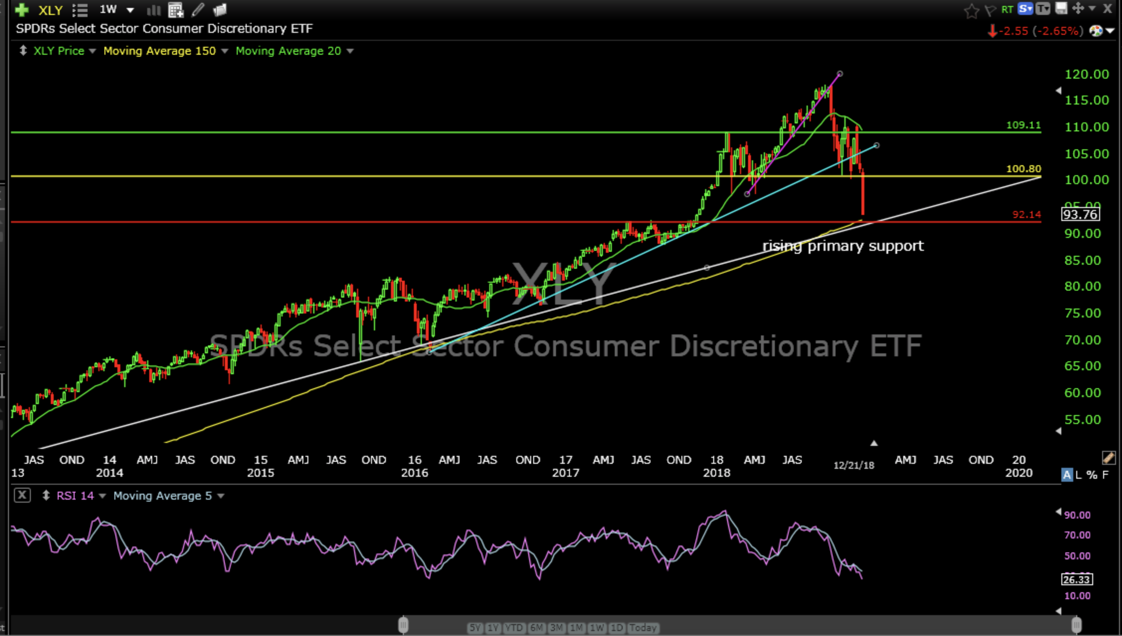 The Consumer Discretionary Sector ETF (XLY) also closed Friday just above support, the rising primary support that has only been broken once, in 2011, since the bottom in 2009.
