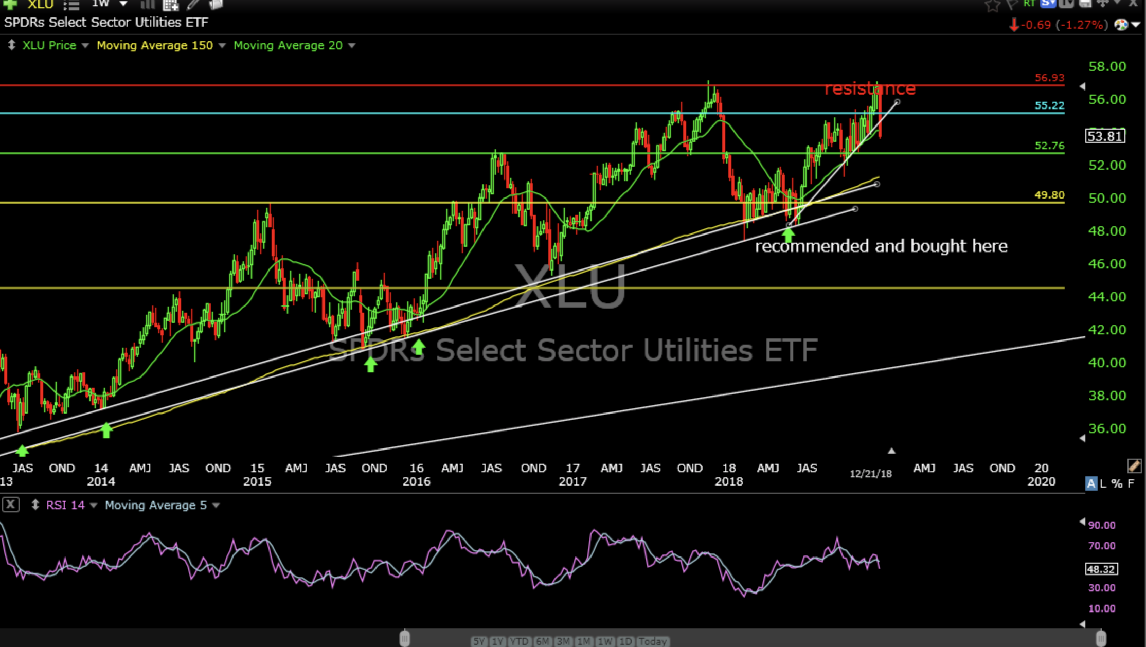 The Utility Sector ETF (XLU) is still trading above long term support from the bottom in 2009. Last week it crashed down through short term support from this year and is currently above it’s next support level by about 2%.
