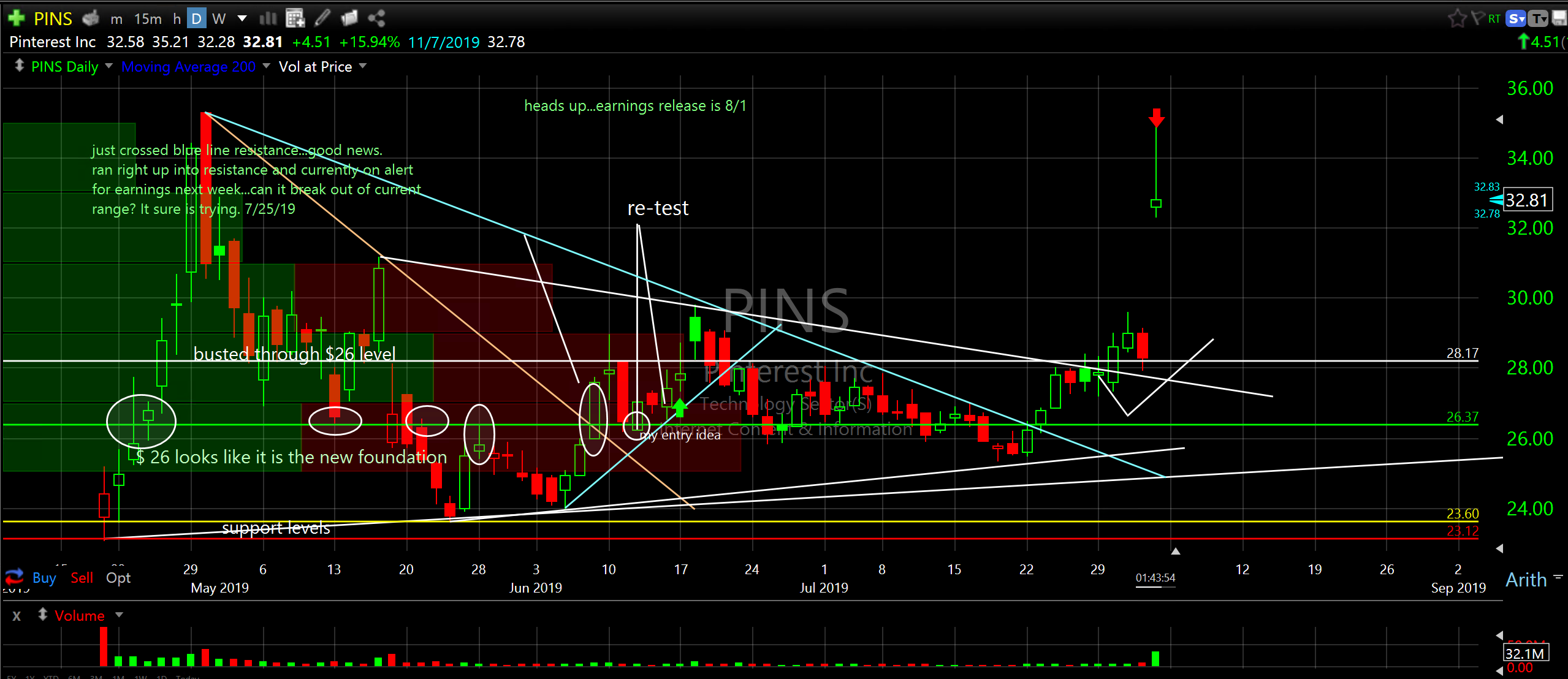 OK, two more things. Pinterest Inc (PINS) gapped up 20% today. Consider taking partial profits. See attached chart. KaChing.