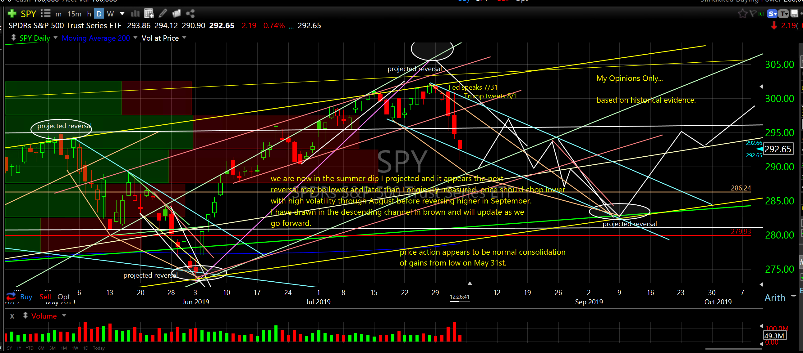 I have lowered price and extended time (SPY 282/283 early September) on the next projected reversal zone. It looks like we are in for another four to six weeks of chopping lower with higher volatility consolidating gains from the closing low on May 31st. Please see the attached chart of SPY for my new notes (in yellow), projections and price channels. Current price action looks to be consistent with digesting recent gains and preparing for longer term expansion in to 2020.