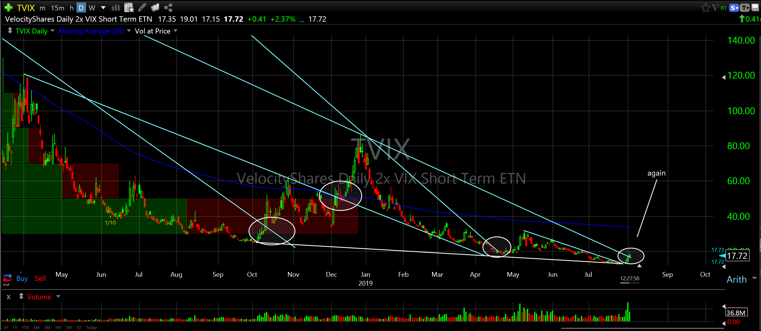 I have also attached a chart of TVIX, a 2X ETN that measures implied volatility. Please note how volatility spikes with crosses of descending resistance which lines up with broader market dips. Pretty cool…right? It just crossed again on Thursday…hmmm…another sign of short term broader market weakness? I think so.