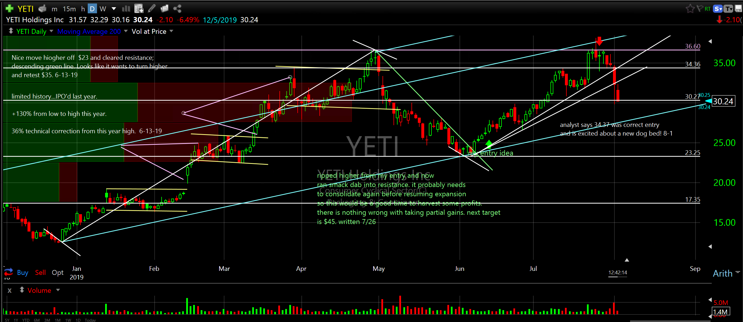 One more thing. I read an article this week about YETI Holdings Inc (YETI). The analyst who wrote it said he saw a cup and handle pattern with a perfect entry at $34.37 and he was really excited about a new dog bed they were coming out with. Are you kidding me? This is the kind of garbage that drives me nuts! See chart attached. My entry idea was $27 and my partial exit idea was $36 (see green and red arrows).
