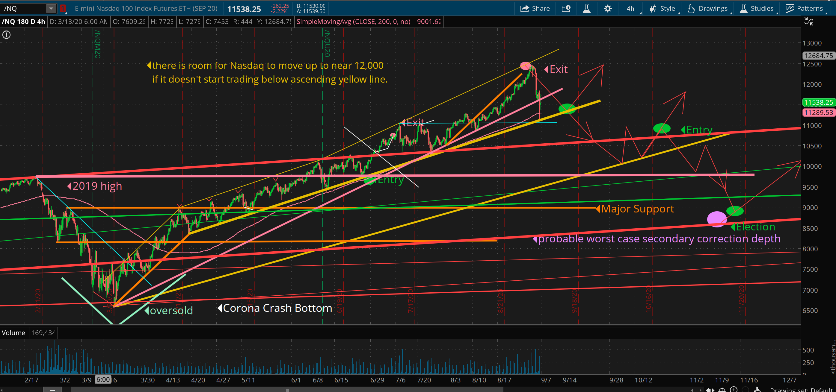 “The Nasdaq is maintaining it’s higher trajectory from late June and has room to run up to 12,000 if it can stay above the ascending yellow line.