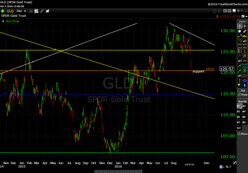 If you remember we shorted GLD in July after price tagged resistance. Hopefully, you participated, because GLD made a big move today; down 3.47%.