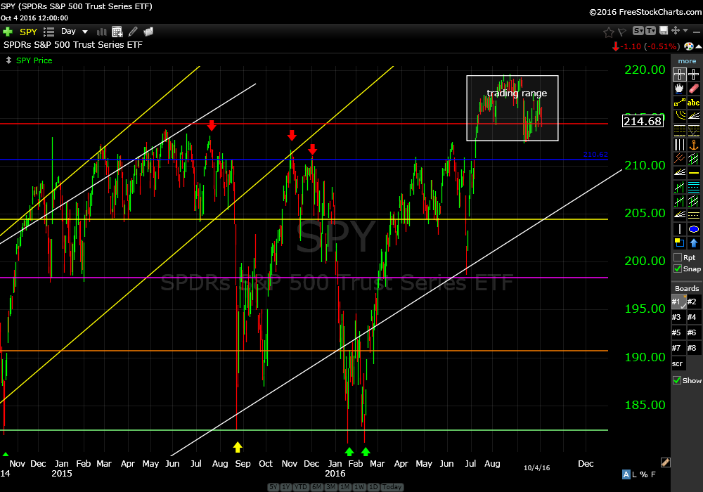 As I mentioned last week, price is stuck in a range and might stay there until the election. See SPY chart (below).