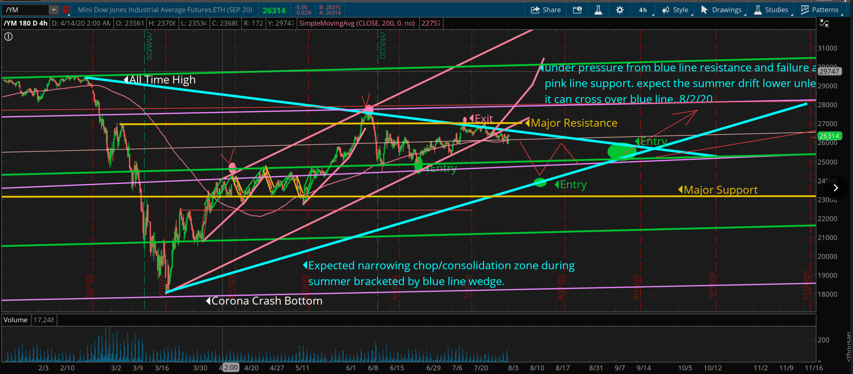 In fact all three proxies (driven by Nasdaq) might fill the higher gap before rolling over later in summer and into the election. The Dow and S&P 500 just might try to challenge the pre Corona Crash highs if the Nasdaq continues to push higher as tech is still running led by the software and semi bulls.