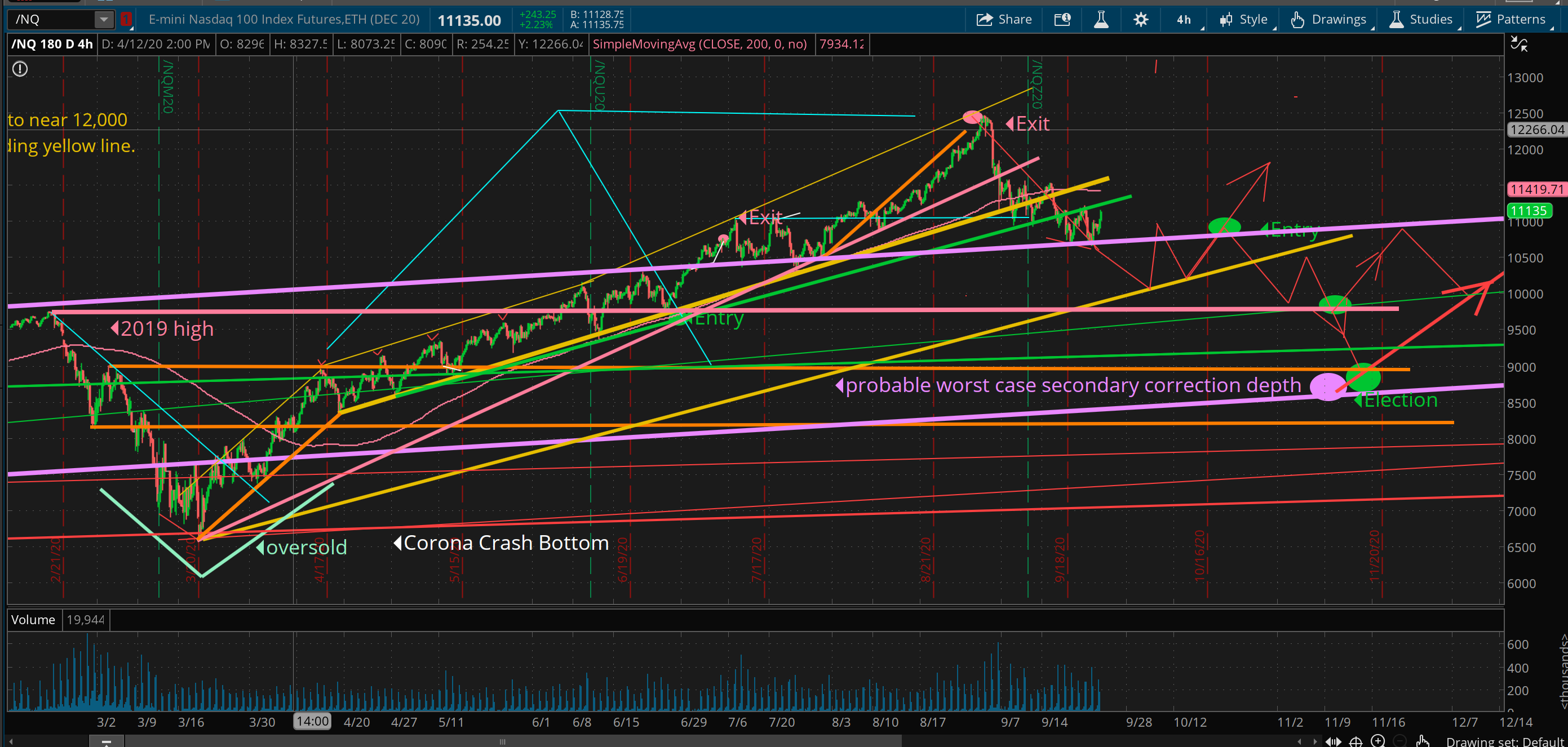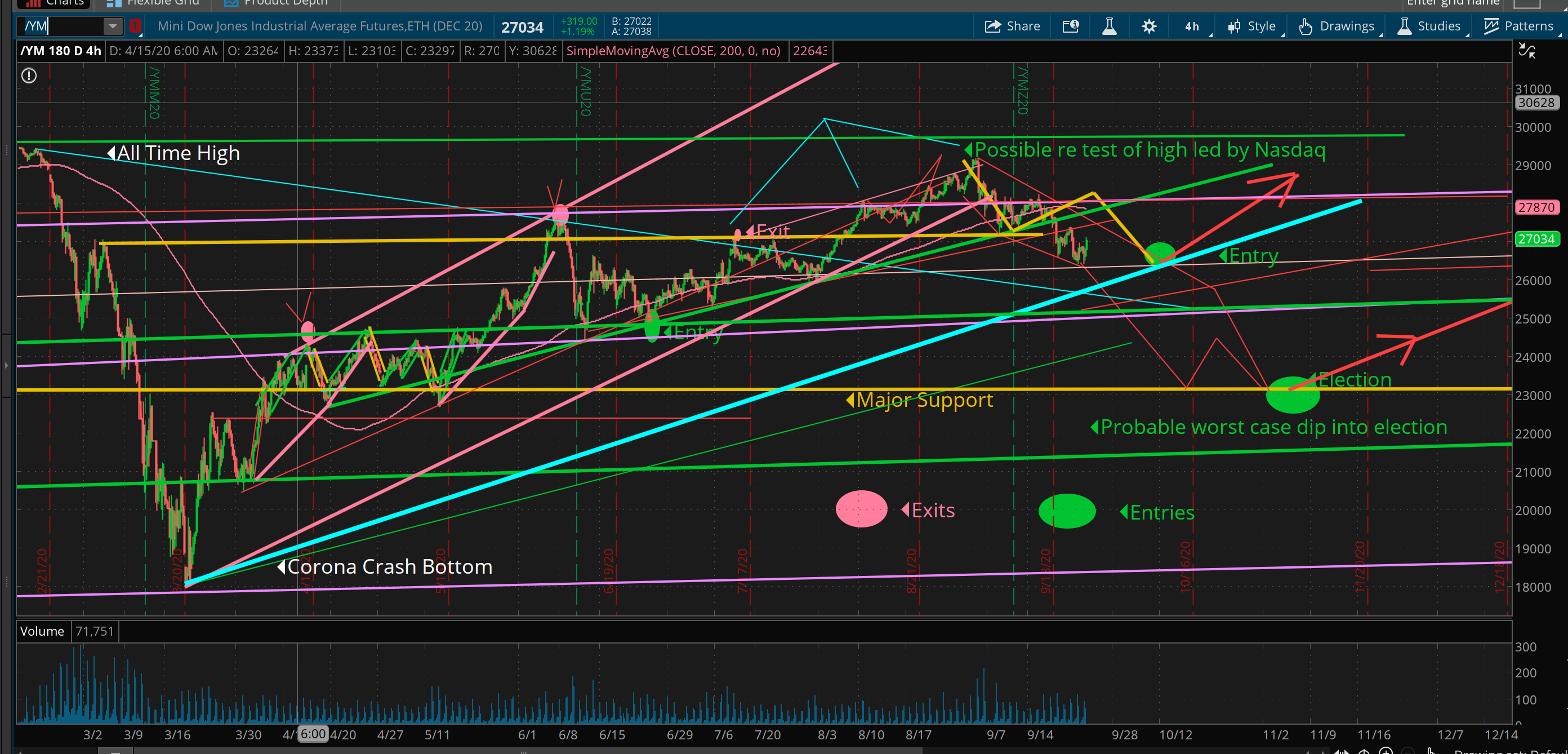 The major averages continue to follow our projections down from the reversal high we forecast for early September. The drawdown has been orderly with large down days balanced by strong recovery reversals resulting in a flatter trajectory lower than the Corona Crash was. While we do expect volatility to increase into the election, current data suggests a worst case depth would be around 23,000 on the Dow and 8,600 on Nasdaq.