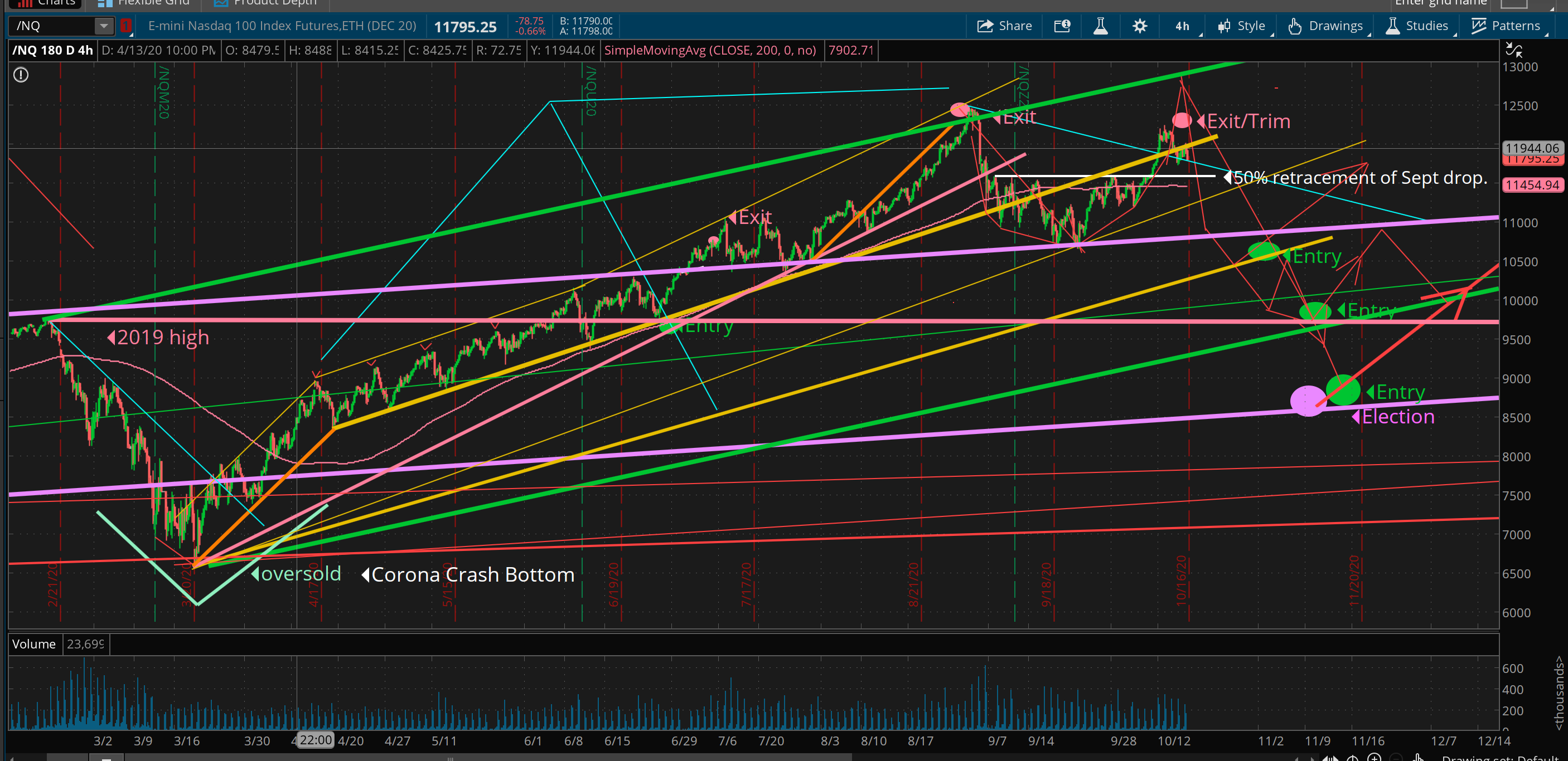I will likely begin hedging soon by buying SQQQ which is an inverse triple leveraged Nasdaq 100 product. These products are designed for short term holding periods and should only be used if you understand how they work. I will email alert when/if I buy SQQQ.