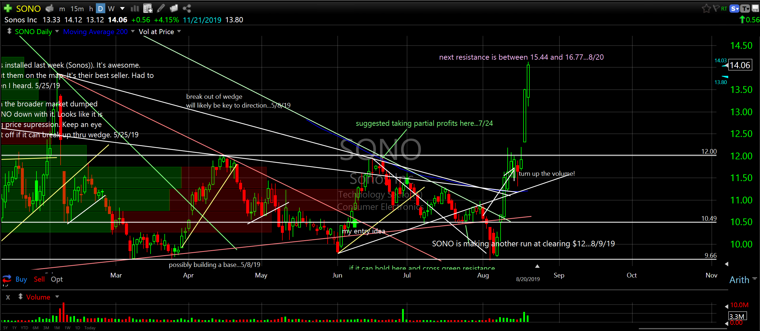 Sonos Inc (SONO) is up about 30% from my June 10th entry idea and nearing another level of resistance (see chart). Consider taking partial profits here. Please note the spike from August 7th to August 16th is almost exactly the length of the spike over the past two days…this is typically the measured length before a significant pullback.