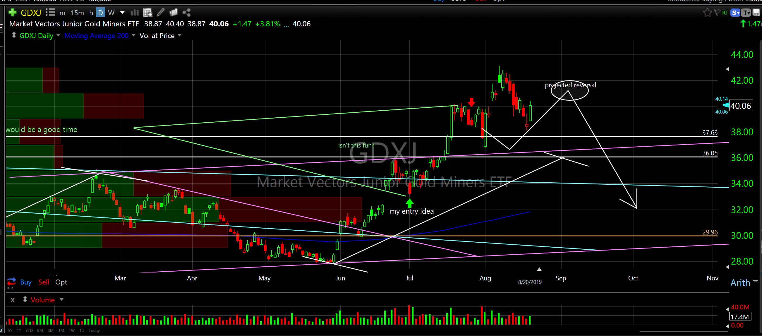 The Junior Gold Miners ETF (GDXJ) is up about 20% from my entry idea on July 1st. I recommended partial profits on July 29th and I think it is nearing another significant top and I expect a reversal lower when the broader market begins to ramp higher soon. Consider taking profits or legging out over the next week or two.