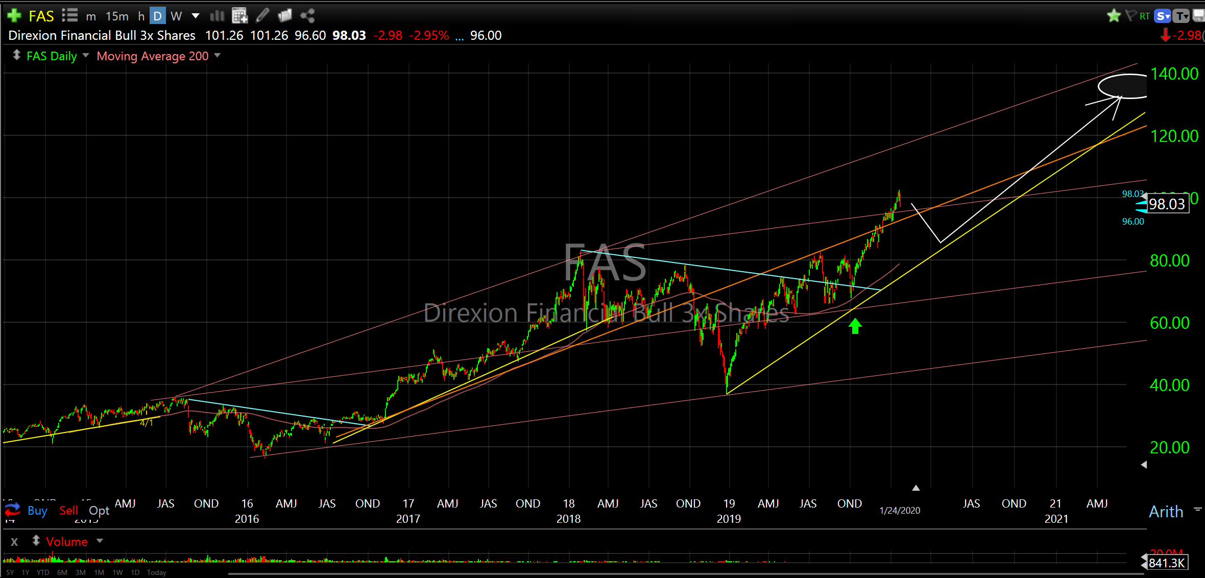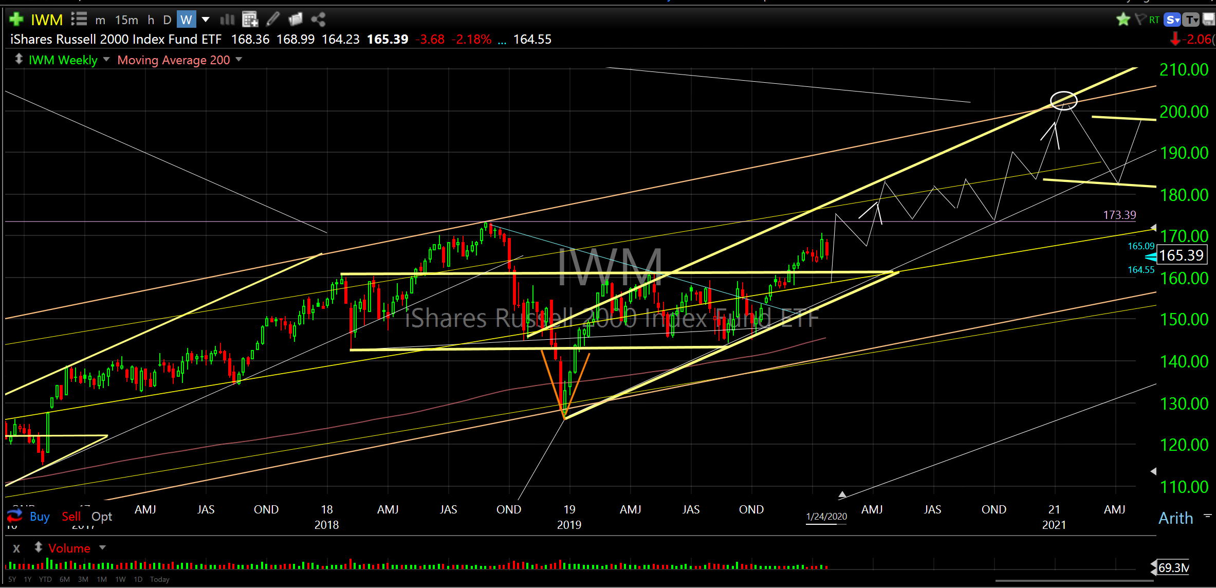 “All broader market indexes have crossed over and are separating from their individual ascending yellow line resistance levels (now support) from early 2018 that I have been referencing for most of 2019. This separation is GOOD. It’s exactly what we want to see. The separation is BULLISH. The expansion has finally begun. Price action is right on it’s expected and projected track and the thrust higher in 2020 should catch most people off guard as there aren’t too many (experts or otherwise) that expect the kind of rip roaring expansion that should take the Dow close to 34,000 before the presidential election next year.”