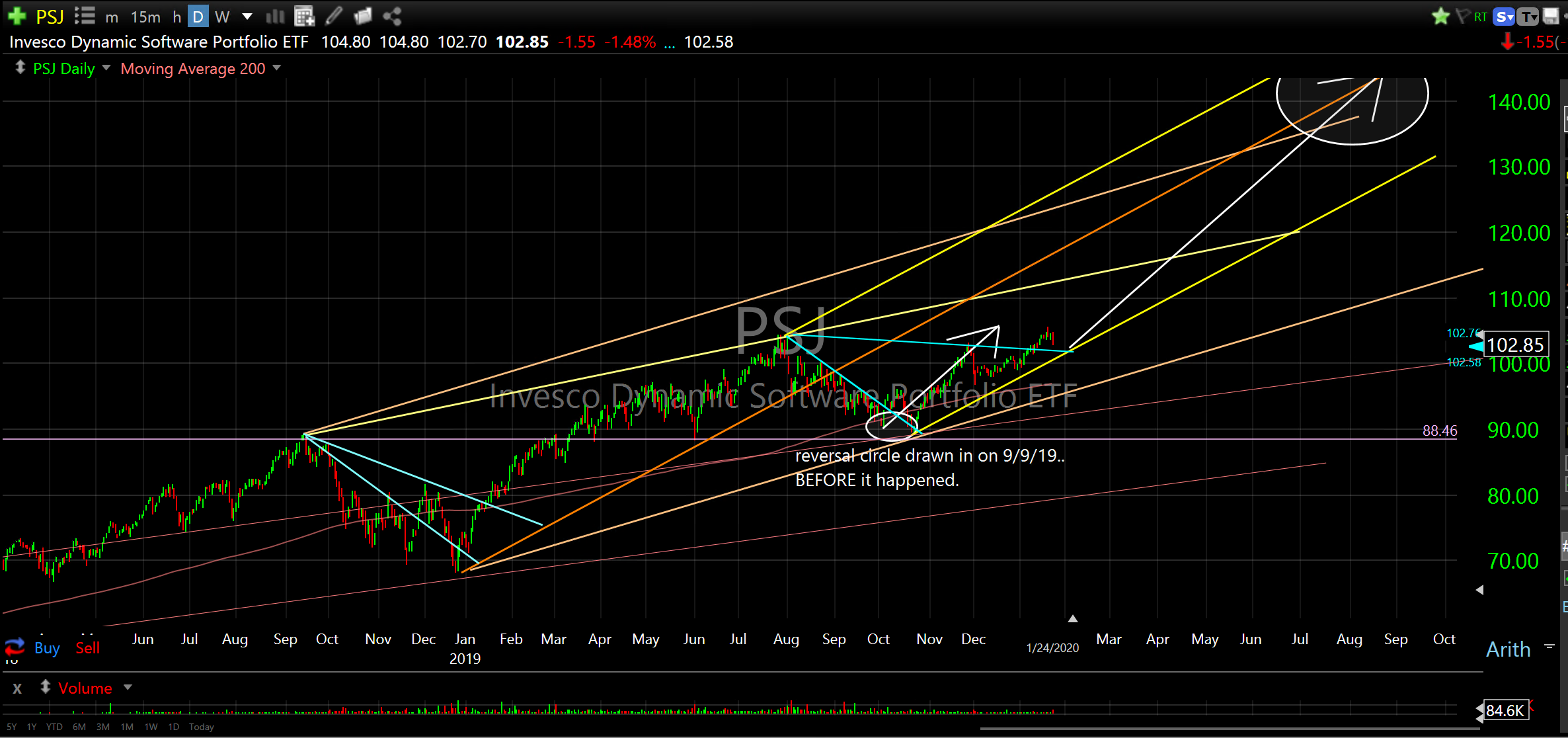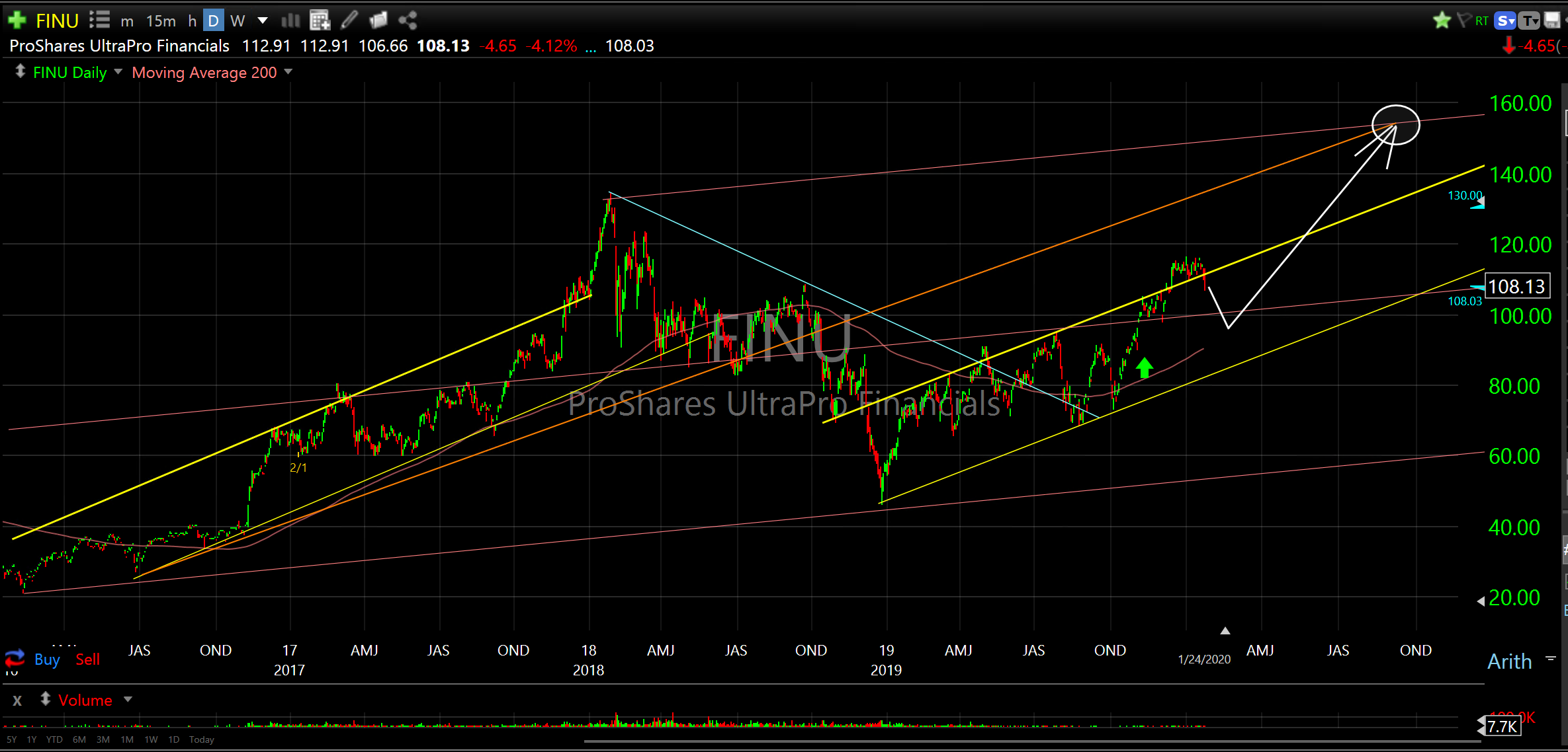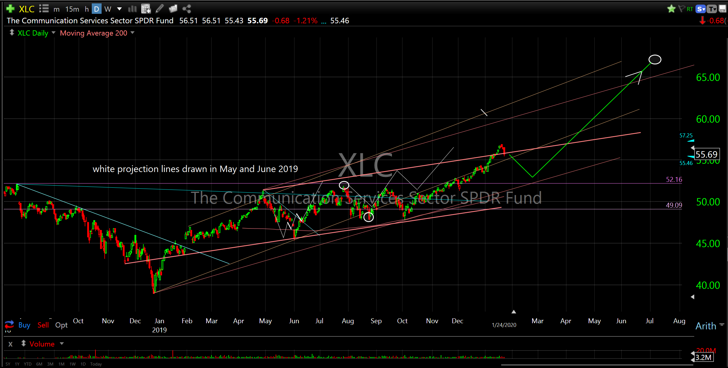 “This does not mean we won’t have choppy price action. We are always vulnerable at resistance levels. In fact, the broader market is on track to run into another ascending resistance level over the course of the next couple of weeks. It would not be surprising or out of the ordinary to get a pullback soon. What I do not expect is anything too deep. See DIA year end price projection chart for expected depth of next dip which might be a re-test of the yellow line ascending resistance level recently crossed over. This is now ascending support. I expect it to hold (at worst a slight dip below) and propel price higher leaving “most” everyone scratching their heads in disbelief and coming up with “reasons” to explain why. Where the heck were they six months ago when they were all crying “yield inversion! recession…recession!”