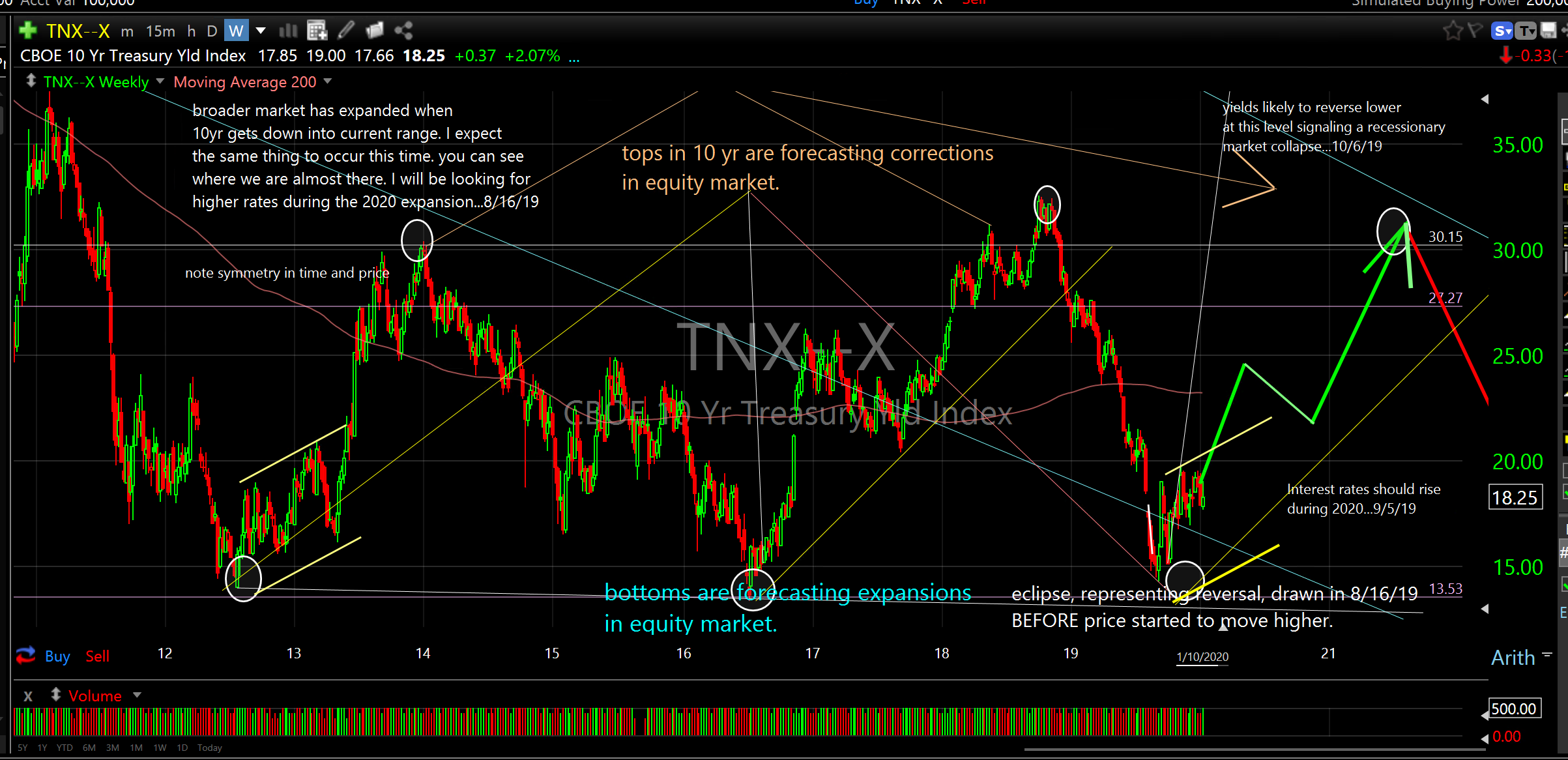A look at the 10 year Treasury shows yields following the reversal/projection I made last August. Yields should continue to track the green line and move towards 30.00 before any deep, significant equity market event occurs.
