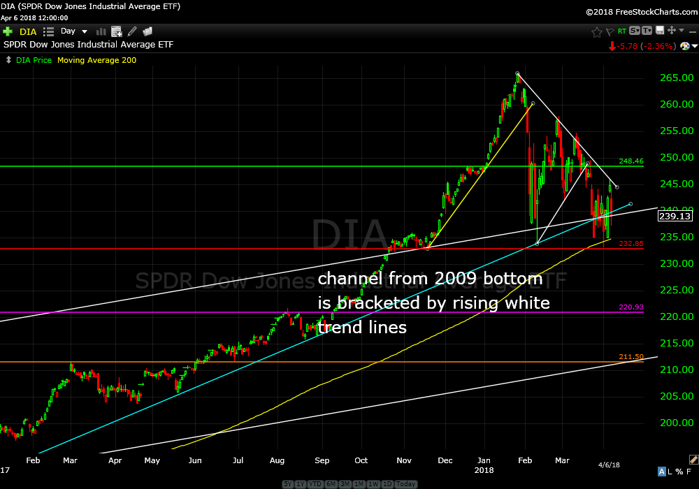 DIA and SPY closed Friday right at the support level that represents the upper bracket of the rising channel from the bottom in 2009 (see weekly charts from the 2009 bottom). I don’t consider closing below this rising level very important. In fact, I consider it healthy and needed to sustain reasonable growth. See DIA daily chart.