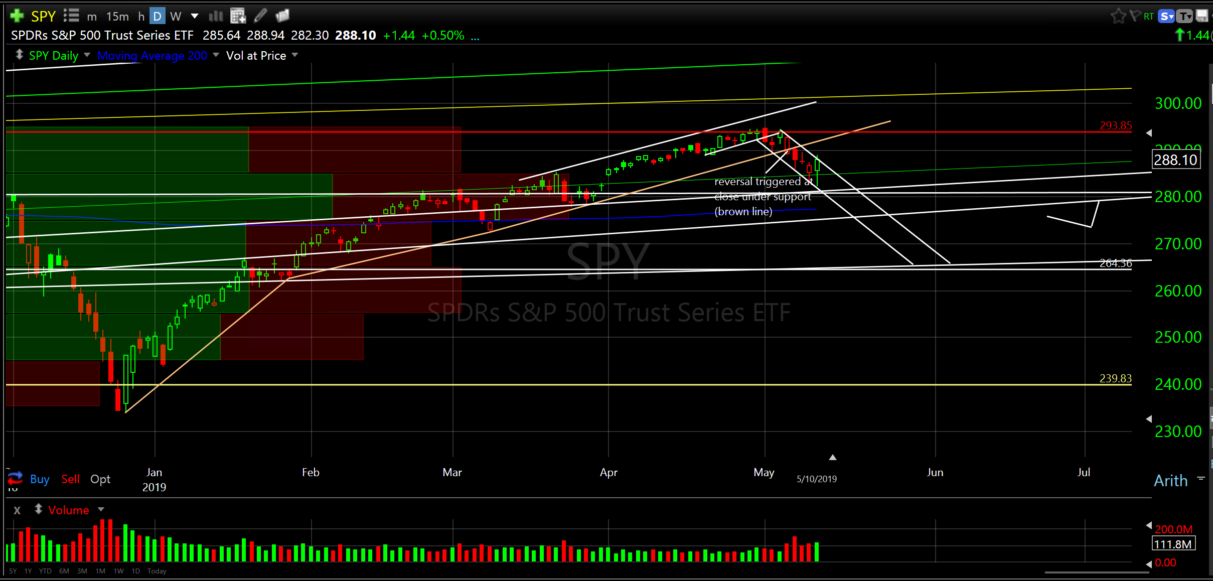 In spite of Friday’s strong close, which was at resistance (not over), I still expect the slide to continue until we get to some serious support which is currently in the SPY 270 region, 6% lower.