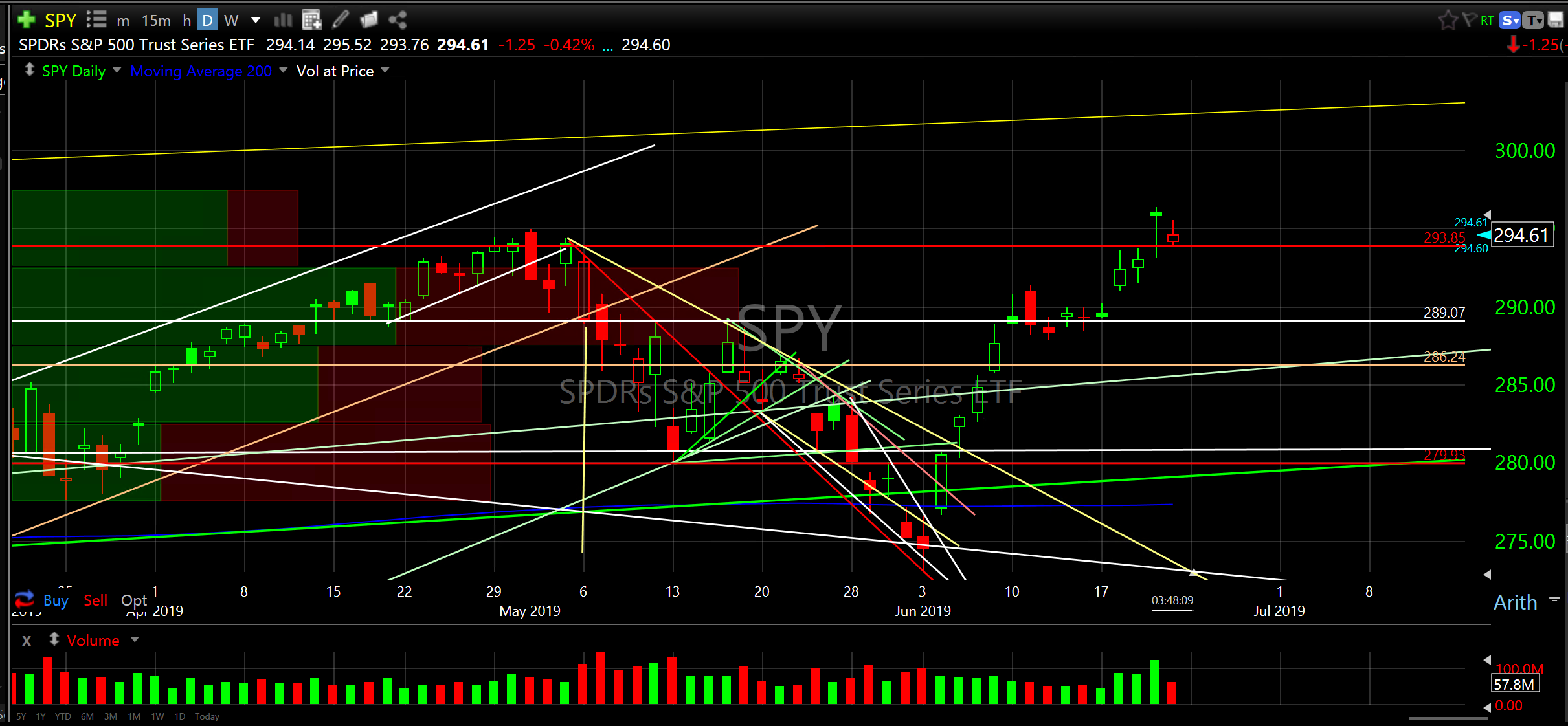 So, party on my friends. My expectation is that SPY will seek the highest ascending yellow line shown on the daily SPY chart below. As summer is seasonably weak I wouldn’t be surprised to see price chop around SPY 295/310 until Octoberish when we might get another dip then start ripping again into the end of the year. Remember, these are my opinions only based on historical evidence. Although I have been highly accurate with my price expectations/projections (even surprising myself) please take my opinions addito salis grano (after having added a grain of salt) and accompany with full dose of risk management.
