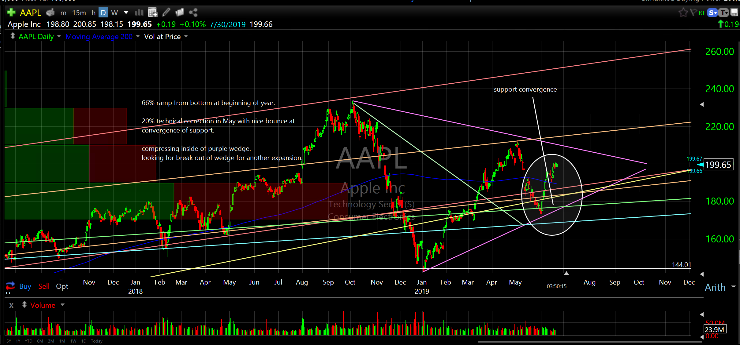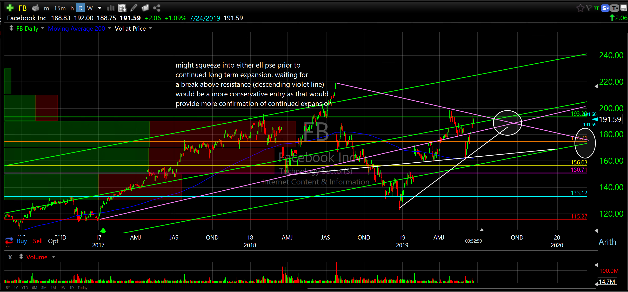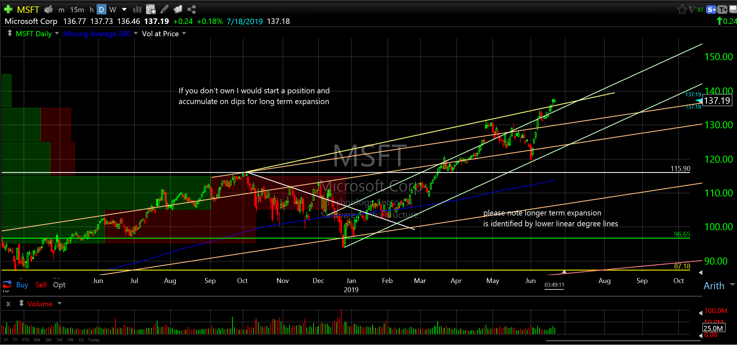 So, if you are on board with the idea of expansion into 2020 and are looking for additional exposure I would consider companies in the upper band of the quality spectrum that have contributed to past expansions; namely, Microsoft Corp (MSFT), Apple Inc (AAPL), Amazon.Com Inc (AMZN), Facebook Inc (FB) and Visa Inc (V). Notes on charts below. Remember, you can accumulate on dips in addition to establishing a starting position if you don’t already own as the entries on these might not be perfect at the moment.