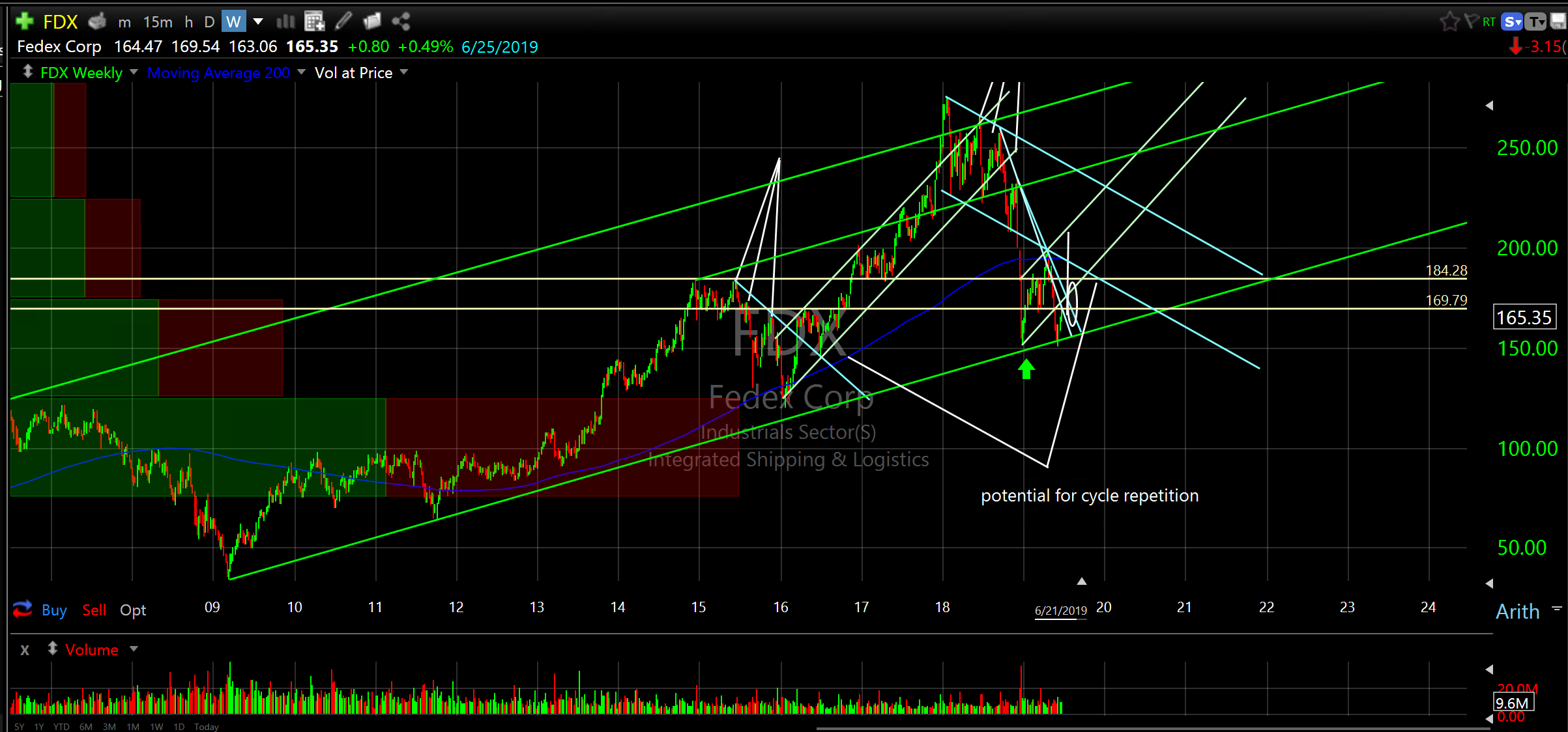Check out the Fedex Corp (FDX) weekly and daily charts. I highlighted this one on January 14th. It ran up to $200 and just re-tested the December 2018 lows and reversed higher. If it can hold support (ascending green line) and start crossing descending blue line resistance then it could go into spike mode. If you like FDX this might be a good place to accumulate more or begin a position. As usual, the more conservative approach is to wait for resistance to be crossed.
