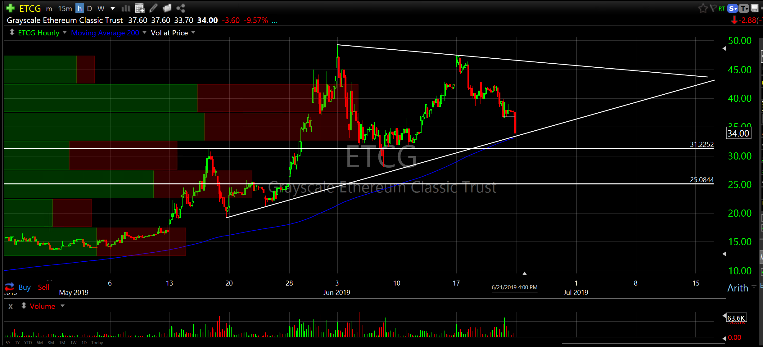 Well, if we are looking at bitcoin we should probably look at Ethereum. Don’t ask me to explain this stuff because I don’t know anymore than you do. The only reason I would buy it is because I thought bitcoin was ramping. But, if you think bitcoin is speculative then Ethereum is very speculative. The charts below are the Grayscale Ethereum Classic Trust (ETCG) daily and hourly. Please note price coming in to support on the hourly chart…hmmm. Now you probably think I’m completely off my rocker.