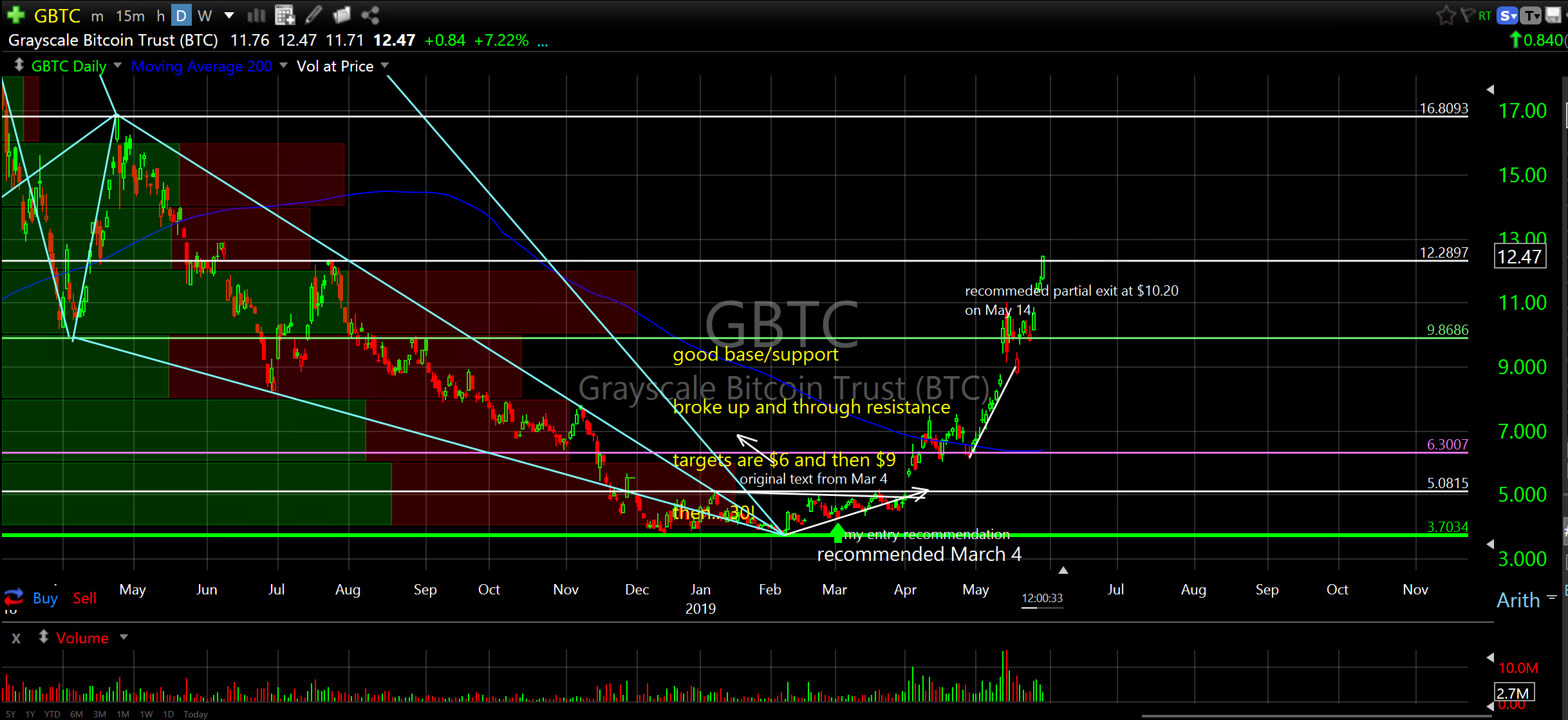 GBTC 180% profit May 30, 2019 by Don Roth I just sold half of my remaining position in GBTC for a 180% gain. KaChing. Grayscale Bitcoin Trust (GBTC) daily (click chart to enlarge) Happy Thursday, Don