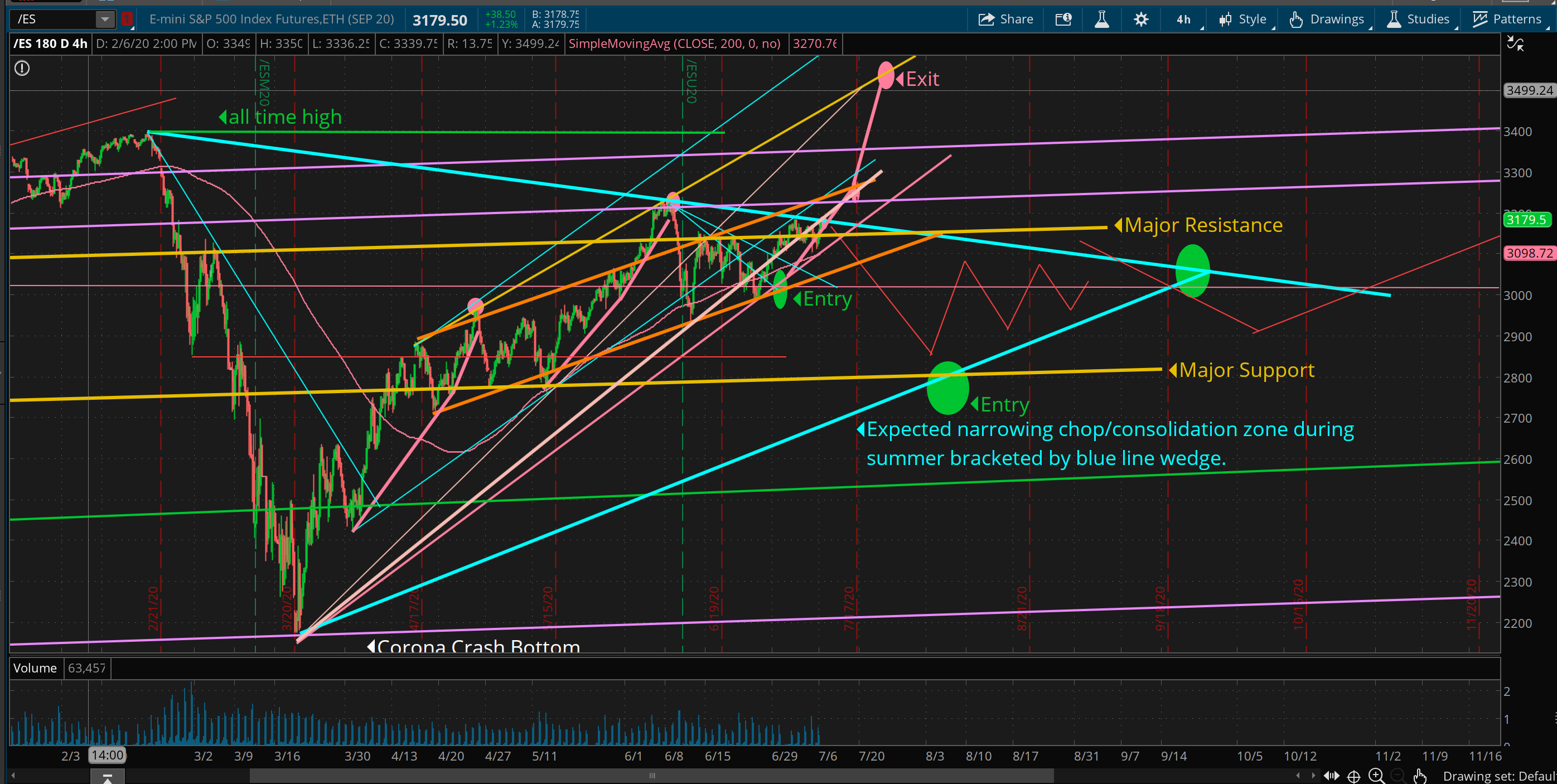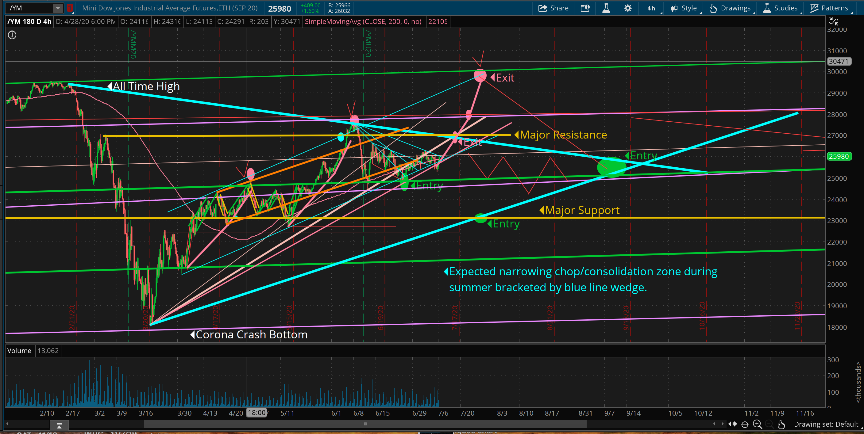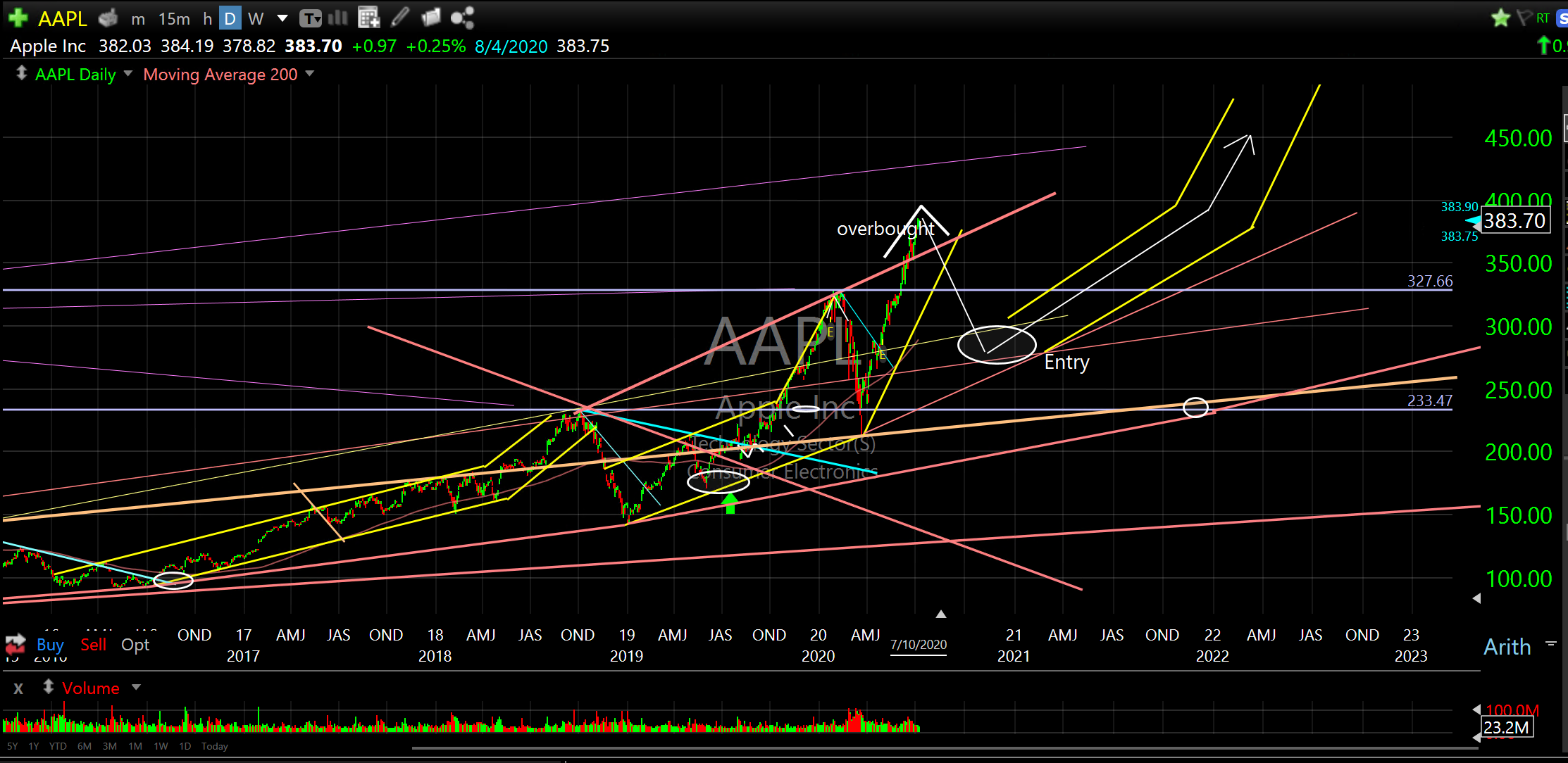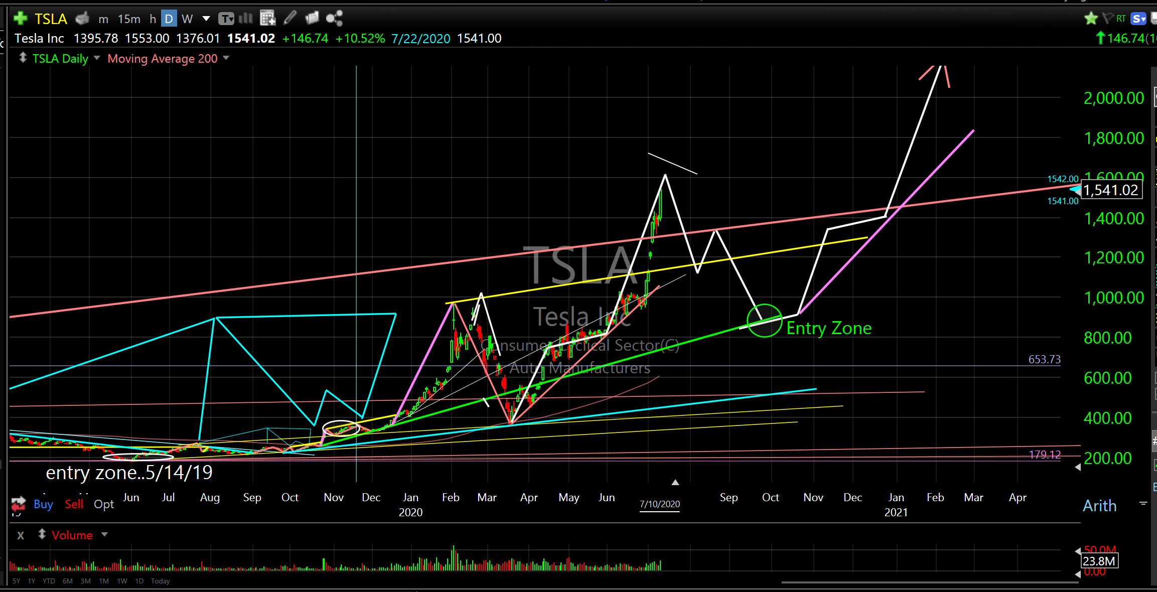 Nasdaq has just ripped higher from the Corona low and now it’s higher than it was prior to the collapse. The Dow and S&P 500 are following along like an old VW bus in a headwind (I know..I used to have one) since they are loaded with underperforming sectors unlike the tech heavy Nasdaq. Software companies (my long time favorites) are going through the moon and TSLA (see chart below for Entry Zone) has gone parabolic.