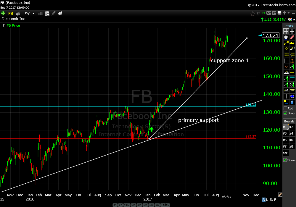 If price violates support zone 1 I will likely recommend selling some if not all. The slope of support zone 1 is an annualized 62% return so this is probably not sustainable. Primary support has a slope with an annualized return of 28% which is much more sustainable for a company like FB in a bull market.