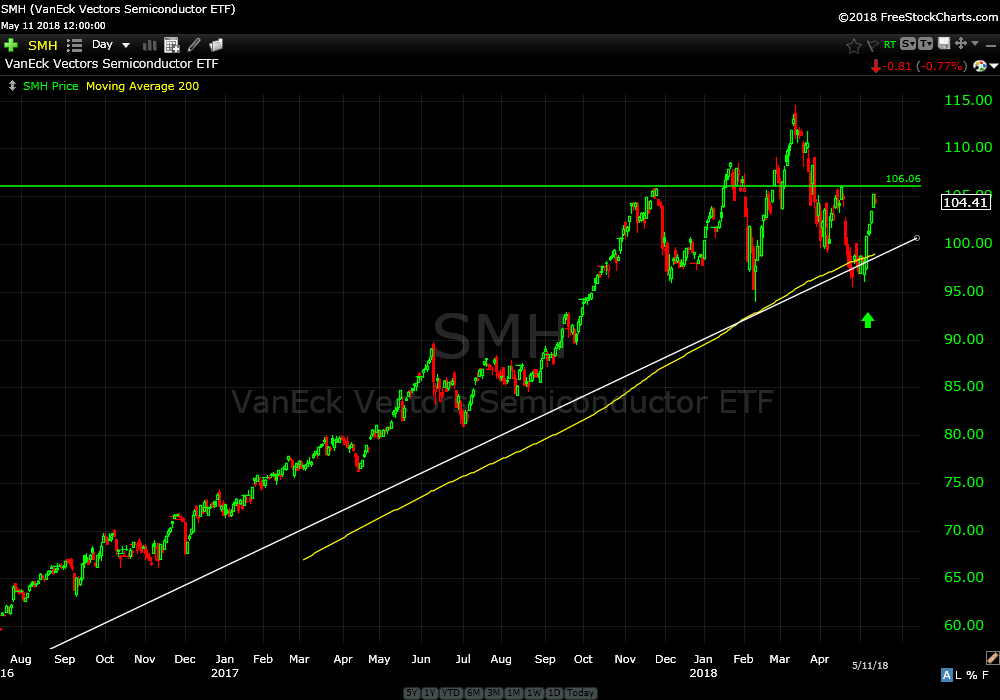 SMH, the semiconductor ETF I recommended last week popped nicely off support gaining about 4% on the week. It looks like price will be retesting the resistance zone again.