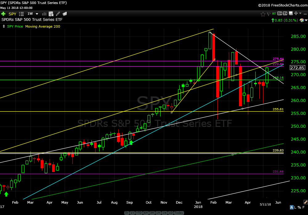 SPY, the ETF proxie for the S&P 500 index gained 2.5% last week as price broke up and through the 268 resistance level that has been a struggle to clear and close above for the past three weeks. This is good, positive price action.