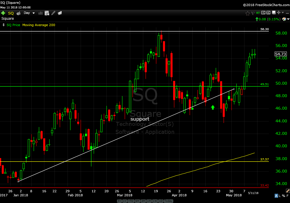 I recommended Square (SQ) a couple of weeks ago. After two days of bad behavior it has been zipping higher. Next hurdle is 58.00.