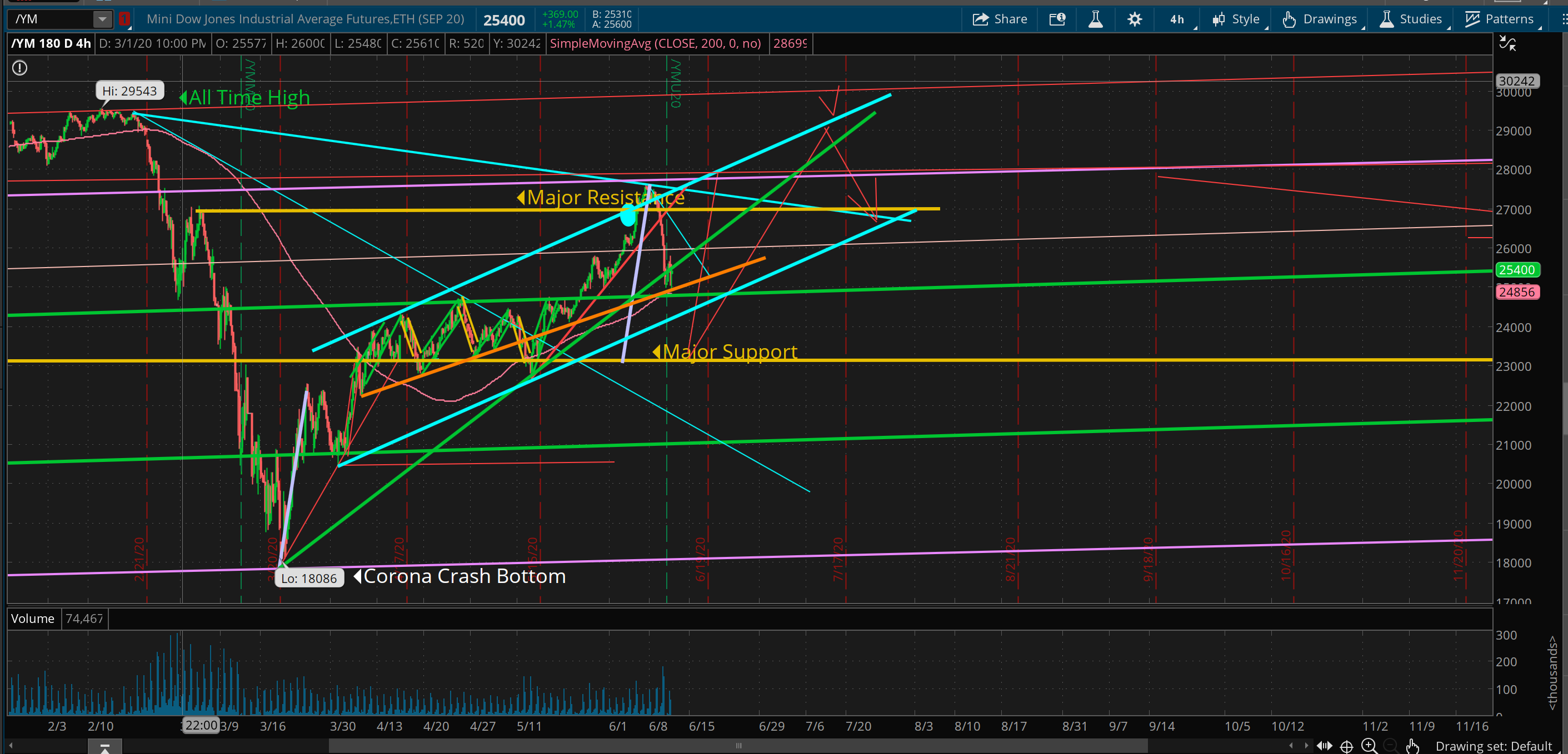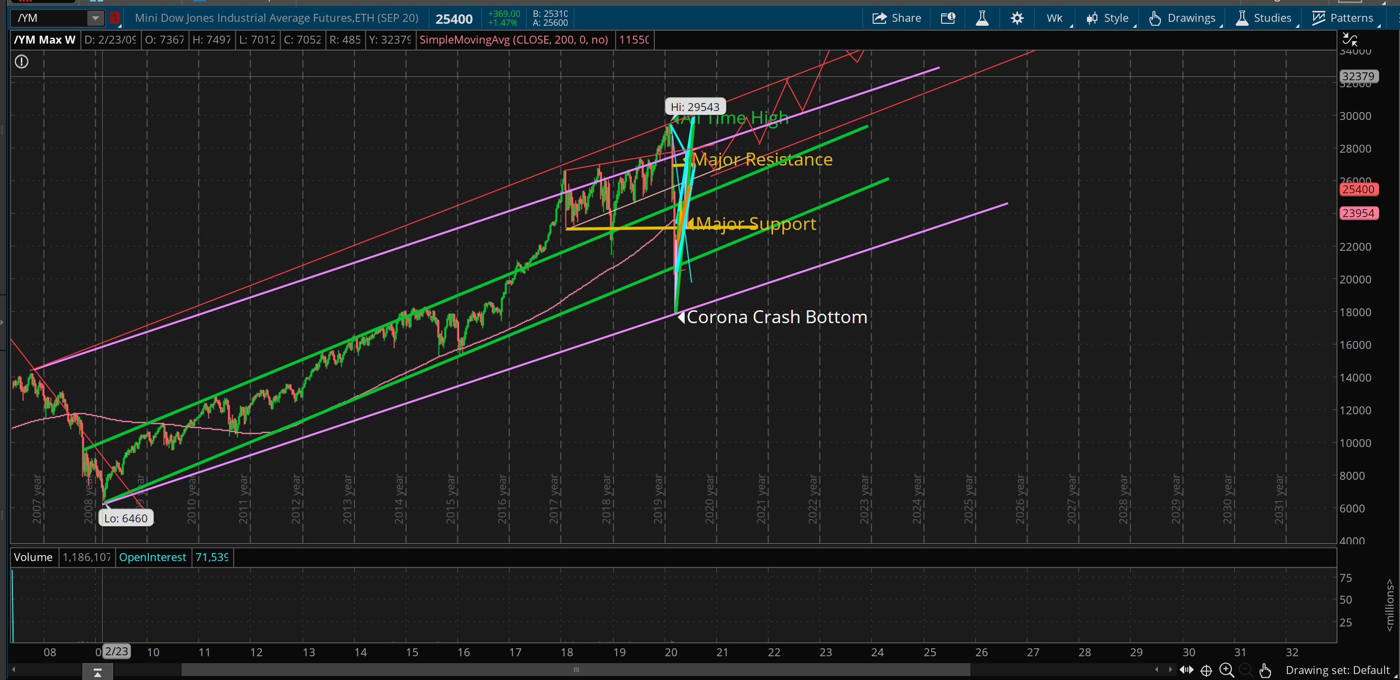 It’s interesting to note that the reversal lower, which began on Tuesday, occurred from a resistance level (upper purple line) that matches exactly the trajectory of the new trend line support (lower purple line) established by the Corona Crash Bottom from the 2009 low. This is important to note.