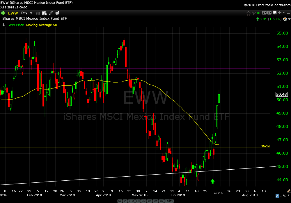 I recommended buying the Mexico Index ETF (EWW) Monday morning after recommending covering the profitable Latin America (ILF) short sell. It’s up about 10% since. Overhead resistance at just above 52. Continue to hold.