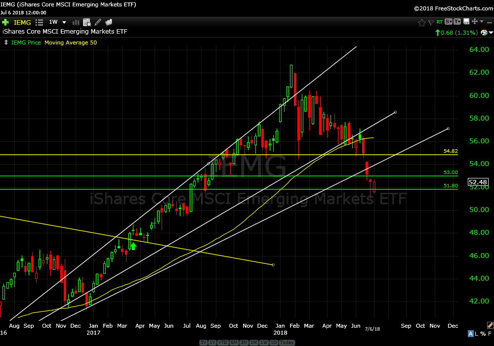 I recommended IEMG, an emerging markets ETF, on March 29, 2017. It is up about 8 1/2%. All support has failed. Sell it and take profits.