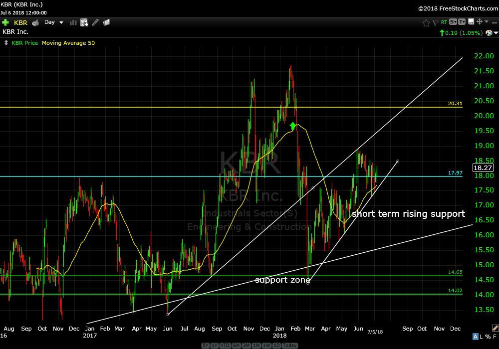 I recommended KBR Inc (KBR) on January 23 this year. It is down about 15%. After the big dump in February KBR has been grinding higher. You can see where the buyers are pushing the buy button…all along the short term rising support zone.I recommend holding.