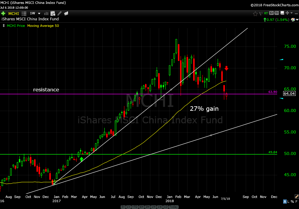 I recommended the China Index Fund (MCHI) on March 29, 2017. It is up about 27%. Price has broken rising support then a failed attempt to rally and now has closed below the 2015 highs. Sell it and ring the cash register.