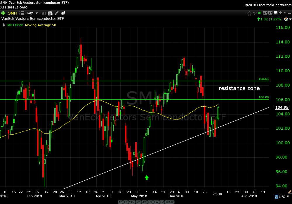 I recommended buying the semiconductor ETF (SMH) on May 7th. Price is up about 4% after popping and fading back in to support. I’m tempted to buy more but there is a lot of overhead resistance. Probably best to not add yet. Continue to hold.