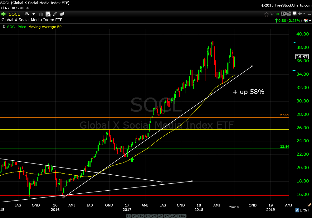 I recommended the social media ETF (SOCL) on January 17,2017. It is up 58%. It continues to get bid up at good support. Continue to hold.