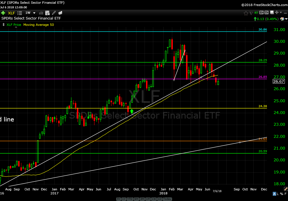 I recommended the financial sector ETF (XLF) on September 28, 2017. It is up about 4% after attempting taking out the pre financial crisis highs from 2007 and fading back. Price has broken support from early 2016 and I am recommending selling the position, collecting a small profit and moving on.