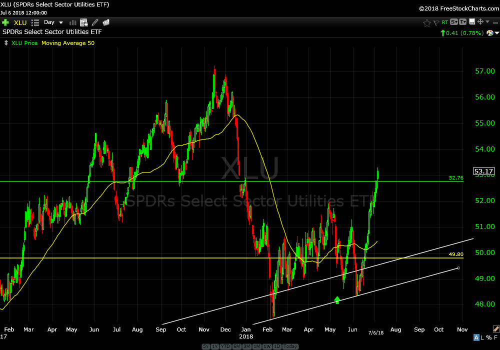 I recommended buying the utility sector ETF (XLU) on May 7th. Shortly thereafter, XLU started out performing the broader market ETF (SPY). Price has shot up about 3 1/2% from my recommendation. It closed today just above resistance. This is where the sellers are lurking around. Continue to hold.