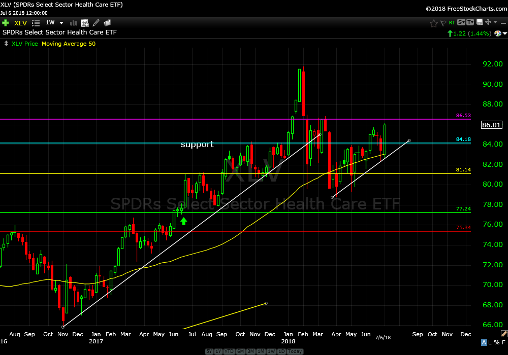 I recommended the health care sector ETF (XLV) on June 21, 2017. It is up about 9%. Price broke support during the February dump, tried to rally then failed again and now it’s getting bid up again. If we can get through $87 we can make a run at the highs from earlier this year. I recommend holding.