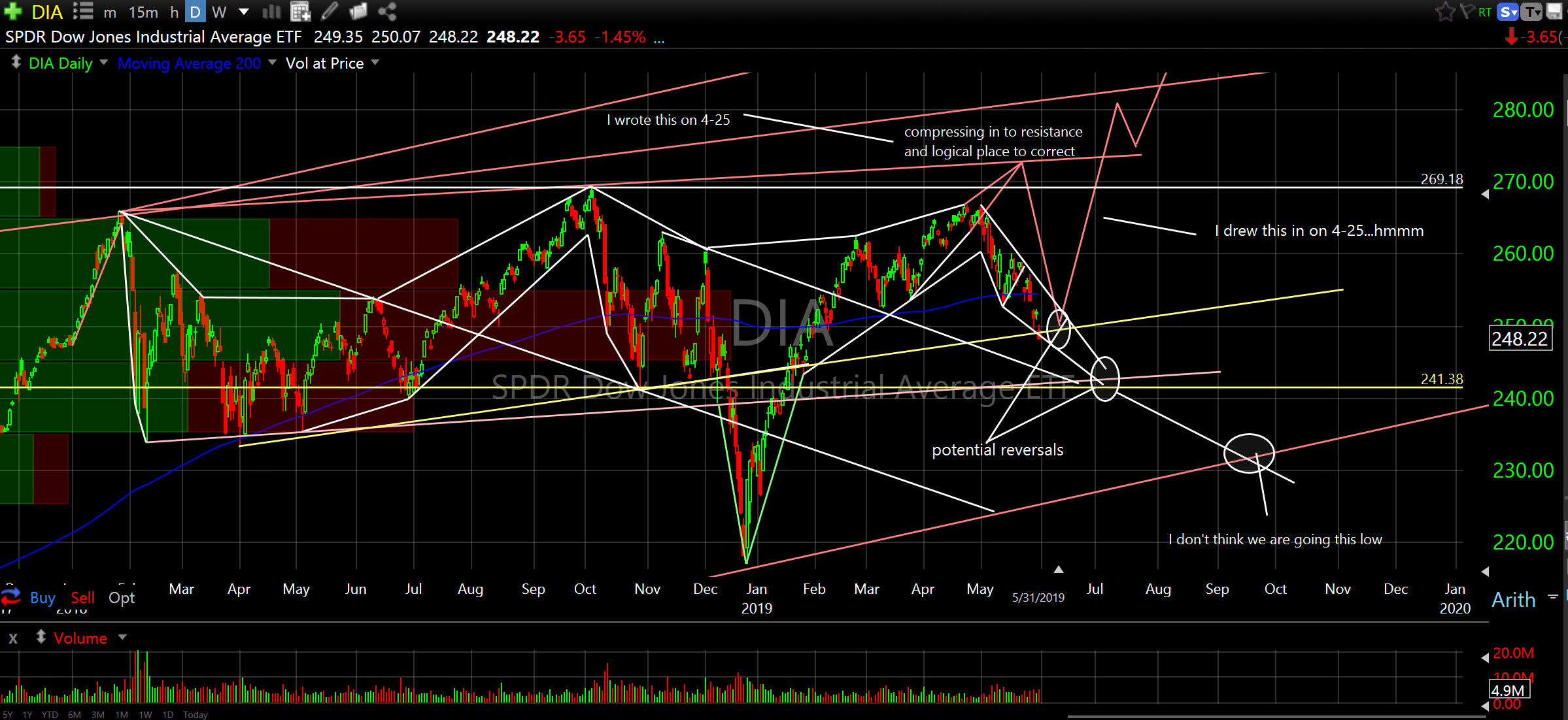 The broader market is bringing most everything down with it as expected. This is an interruption in normal price action. Unless there are larger problems lurking out there we should see a reversal somewhere around DIA 241 which makes sense as a 50% retracement is pretty normal.