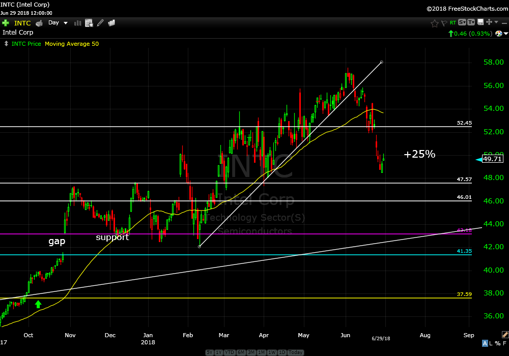 I really hate selling INTC. It’s been such a good performer from my October 9, 2017 recommendation until the last two weeks. We are up 25% in about 9 months. Book it Dano. This doesn’t look like it’s going straight back up any time soon. Long term looks good but I would prefer to take profits for now and avoid any possibility of further decay. Remember, you can always leg in and leg out.