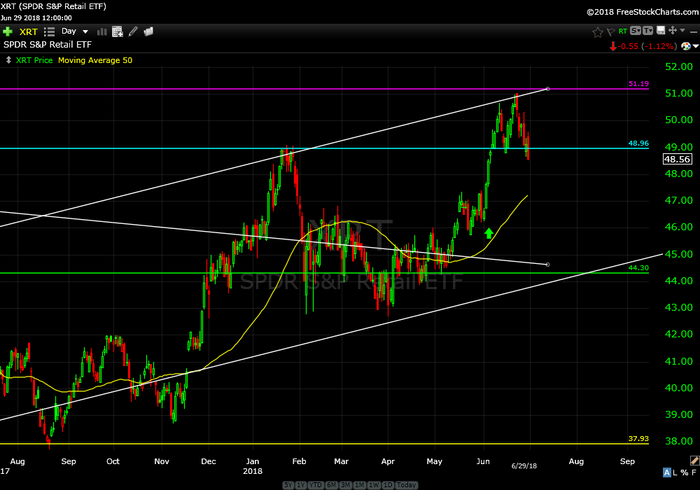 Retail popped nicely after I recommended this last month. It’s up about 3% after being unable to absorb the overhead supply from 2015. Sell and book a small profit as price is likely to go lower before attempting another run at taking out the highs from 2015. Trade smart and we’ll look for a better entry.