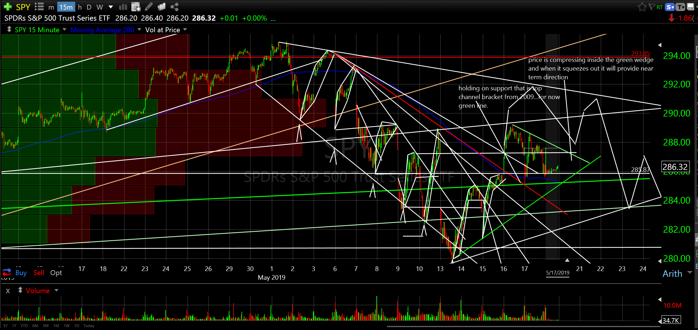 SPY, the S&P 500 Index ETF, was all over the map this week. It broke above the top of the descending channel from the downward reversal that began at the beginning of the month and went half way up to the highest descending resistance before the slow collapse began Friday morning. Price also retraced about 60% of the dip from the last two weeks. This is a normal retracement and if the descending green line gets taken out price is likely to continue sliding. I still like the broader market longer term but we might get a bit choppy during the summer months. I’m still thinking SPY 265/270 is a likely place to bottom for a robust expansion into late 2020. See 15min chart below for a closer look at price action in SPY.