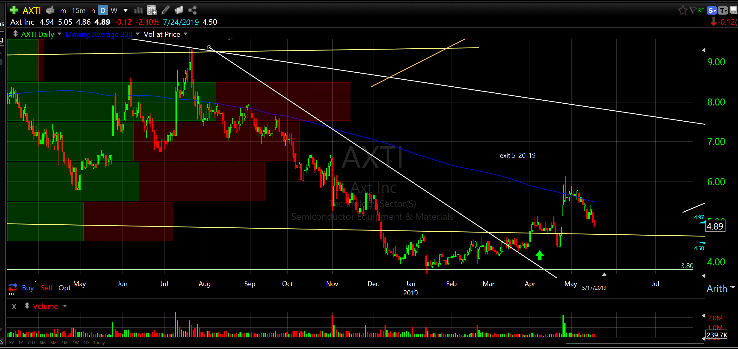 AXT Inc (AXTI)… exit for a very slight gain. I don’t like recent price action and I think it might just slog down for awhile before resuming expansion. I think a better entry awaits in the future. I think I was wrong on the timing of the entry on this one. Sorry.