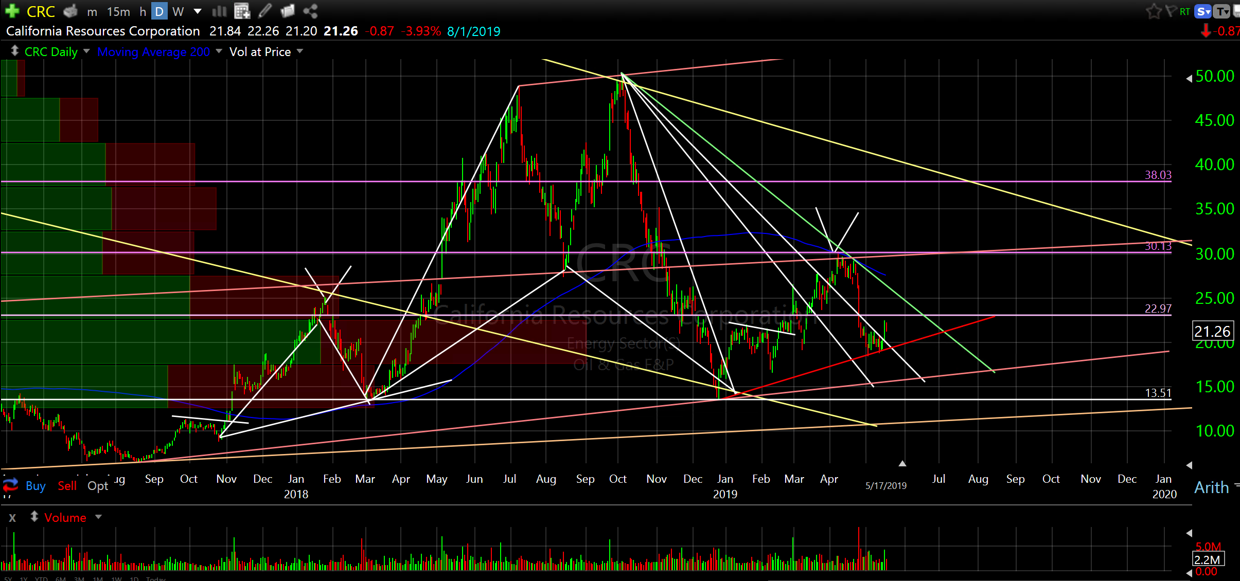 California Resources Corporation (CRC)…This one is high risk/wide range. Please note correction late last year, $50 to $15, bottomed at $15 then doubled to $30 just this year. Now it’s back to $20ish and trying to base. Use ascending red line as support. If it breaks below red line it will seek lower support (ascending pink line). This is one where I would leg in slowly.