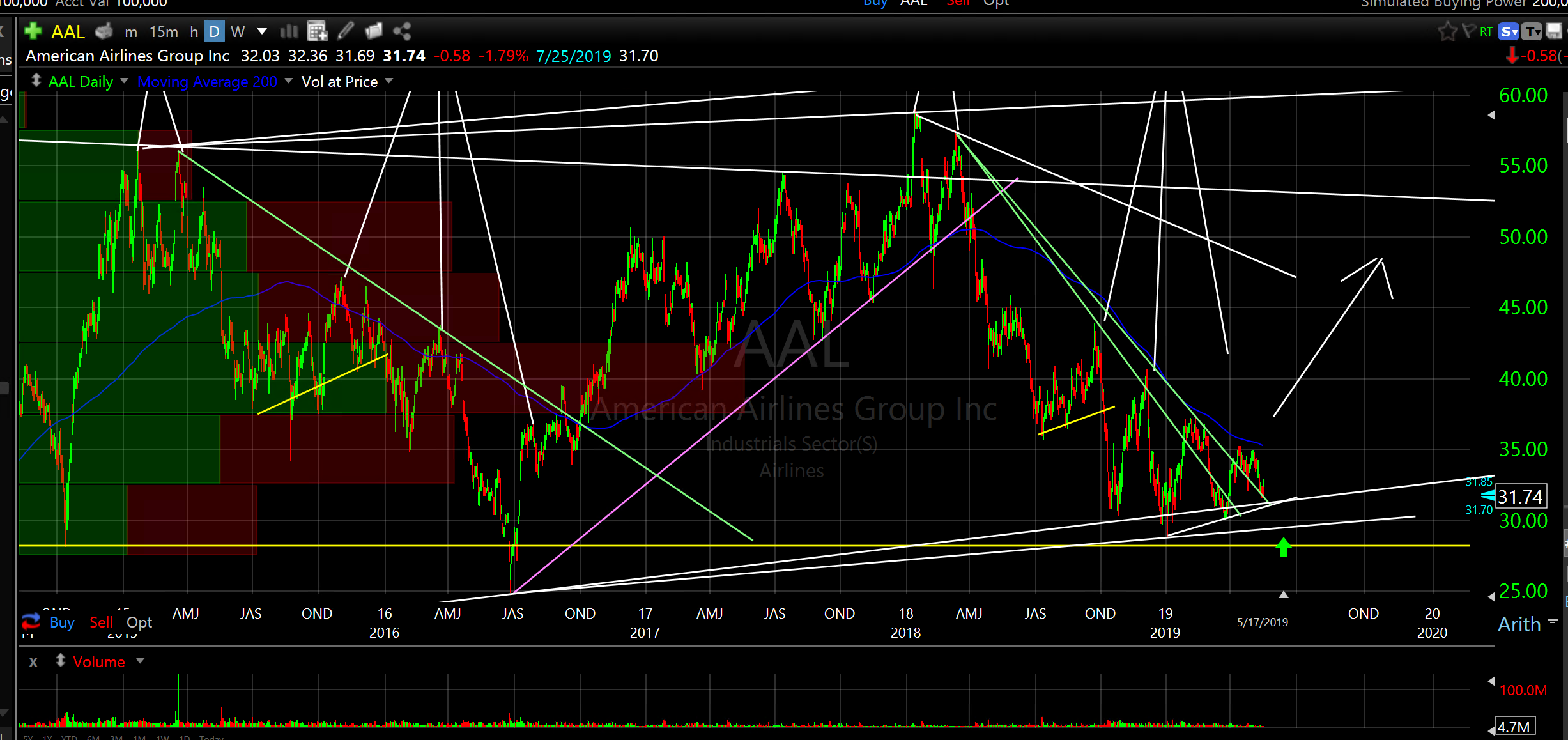 American Airlines Group Inc (AAL). I love this chart. Long multi year support with consistent, historical expansion from high 20’s. Good shorter term bottoming formation since free fall in October. Multiple breaks up through descending resistance (green lines). Classic low risk/high reward entry. Pays a dividend of 1.26%.